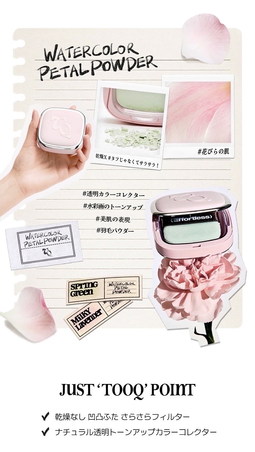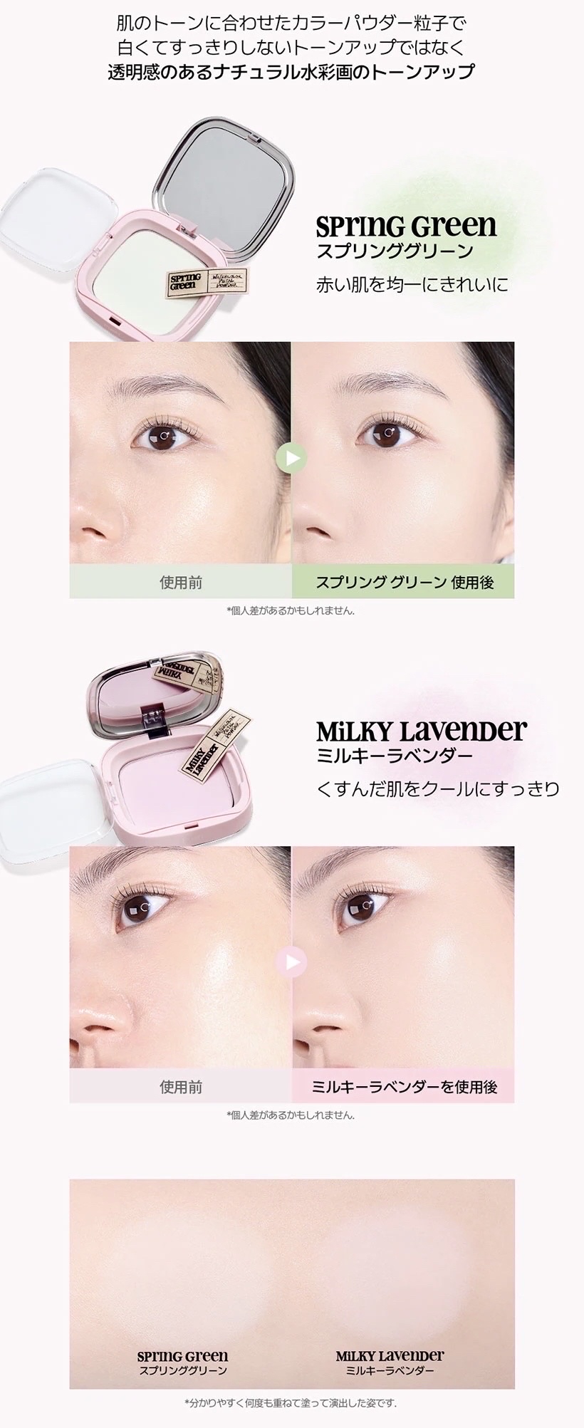 - セミマットタイプのパウダーがtooqから登場しました。 カラー展開は2色とも肌トーンを補正し、気になる毛穴や油分を適度に調節して乾燥せずにさらっとした肌に仕上げる万能パウダーです。 緑色のスプリンググリーンは赤みが気になる肌向けで、肌トーンを均一にしてくれます。 ピンクのミルキーラベンダーはくすみが気になる肌に使用することで肌トーンをあげ、華やかな印象に仕上げます。