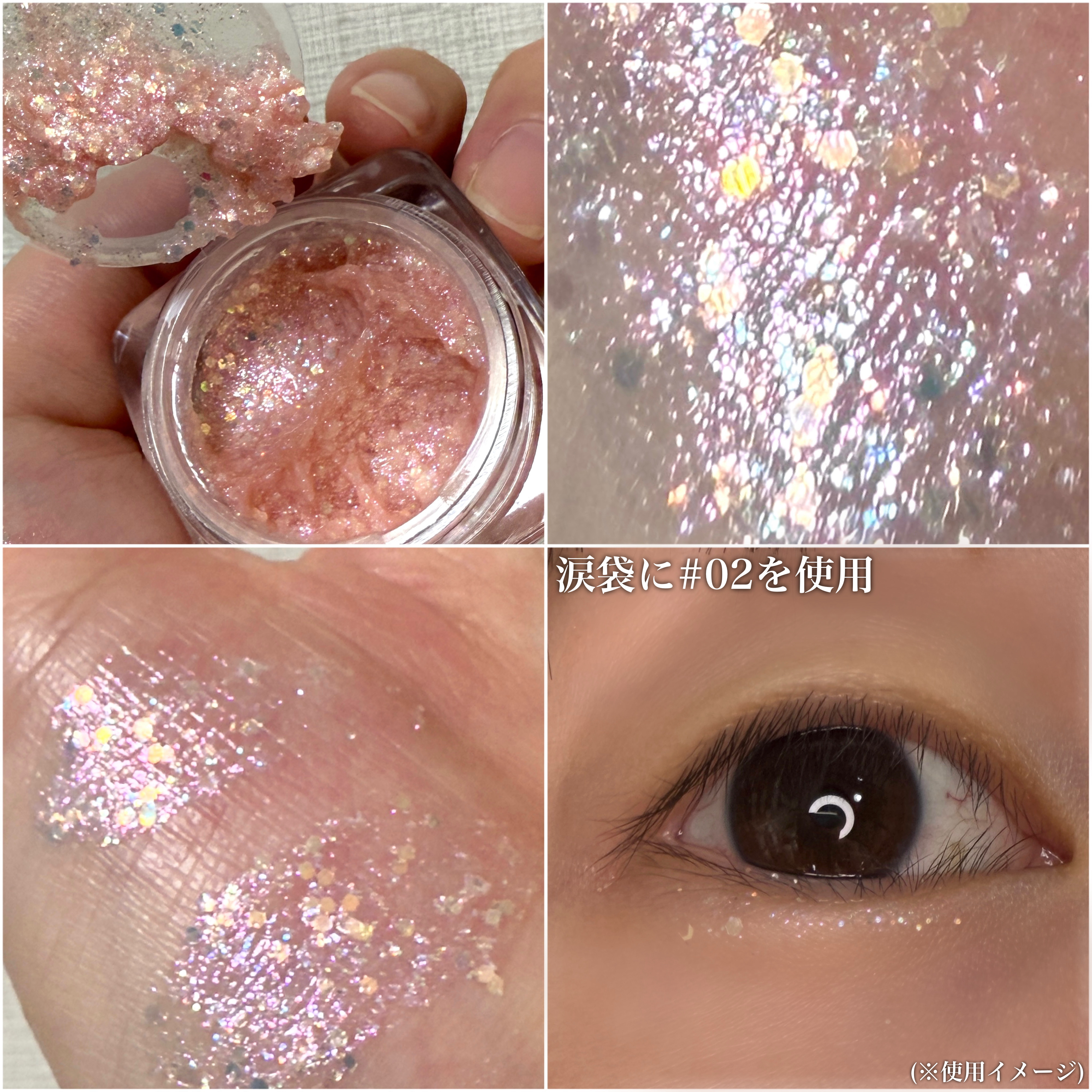 アイドルグリッタージェル全4色各1,760円(税込)#01tutuwhite.#02pinkybuzz#03nightout#04sunsetdream01と02を使ってみました!アイドル級の目元が叶う!とにかくキラッキラで大粒なグリッターが...
