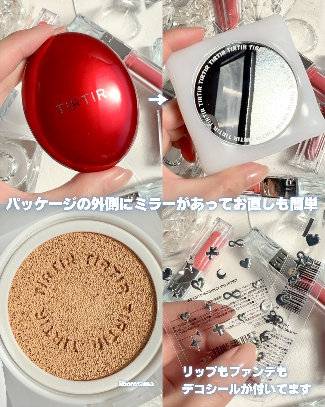 🤍TIRTIRコラボ新作!超無敵クラス🤍TIRTIRのコラボ新作がでてますよ〜🏃➡️日本テレビ系列・学国バラエティ番組の超無敵クラスと共同開発してZ世代がこだわり抜いたリップとクッションが発売中です🛒🤍メルティンググロウデュアルリップ 1,650円(税込)特徴は✏︎♡体温でとろける保湿感たっぷりのバームにTIRTIR初のブルーラメ入りプランパーの2in1リップでおでかけはこれ1本でOK♡リップバームで華やかに、プランパーを重ねて魅力的に♡セルフデコリップステッカー付でパケをデコれる使ってみて✏︎バームだけでもとろける塗り心地なのに青ラメ入りプランパーも一体化されてどんだけぷるぷるにしたら気が済むんや重ね塗ればそれはもうちゅるっちゅるのぷりぷりリップメイクが叶います🫶🏻とにかく水光感水膜感がすごくて飴玉みたいな艶感が素敵ッス!飲食したら色なくなるけど細身だし1本2役なのでガンガン持ち運んで塗り直したい所存。バームはむちむち、プランパーはスーッとした使い心地です。ラメがとても繊細でかわいいね…☺️なんとデコシールが付属しており可愛くデコれるのですが全然ギャルじゃないから絶望的にセンスがなかった。悔しいよ。カラバリはイエベ向けカラー2色ニュートラルカラー向け2色ブルベ向けカラー2他の計6色展開▼▼01PEACHPUMPKIN落ち着いたコーラルベージュ イエベ02TENDERBRICK熟したオレンジブラウン イエベ03RICHAPPLEリッチなレッドブリック ニュートラル04PEARLROSYニュートラルなコーラルパールレッド ★ラメあり ニュートラル05PINKUAソフトなミューテッドモーブピンク ブルベ06HUGMAUVE雰囲気をプラスするモーブプラム ブルベお気に入りはもちろん01白っぽオレンジだいすき人間!🍊ヌーディでおしゃれなベージュがデイリーメイクにぴったり。━━━━━━━━━━━━🤍マスクフィットレッドクッションWhityEdition2,970円(税込)特徴は✏︎♡TIRTIRクッションファンデで1番人気のレッドクッションが卵型のパッケージからブランド初のスクエア型のかわいいパッケージに♡パッケージの外側にミラーを付けたのでお直しも簡単♡ハート形パフが小鼻など細かい部分にも使いやすい♡セルフデコリップステッカー付でパケをデコれる使ってみて✏︎TIRTIR初の四角いファンデ、中身はよく知るあのレッドクッション個人的にTIRTIRのクッションの中で1番レッドクッションが好きなのでハッピーっす!密着力があってヨレにくく程よいカバー力。1番人気も納得。スウォッチカラーは17CPORCELAIN:明るい肌色結構明るめで色白さんにおすすめなカラーですね最大の特徴はかわいいハートのパフと外側に付属されたミラーとデコれるシール。中にもミラーついてるんだけど外にもつけてくれる優しさに感謝。汚れに注意⚠️デコはセンスが必要って学びました。たぶん好きなキャラのシールとか貼ってもかわいい。ホワイトのパケがかわいくてテンション高まるのでおすすめぜひチェックしてみてね👐🏻@tirtir_jp_official#PR#TIRTIR#ティルティル#メルティンググロウデュアルリップ#マスクフィットレッドクッション#新作コスメ#韓国コスメ#新作コスメ2025#ベースメイク#リップメイク