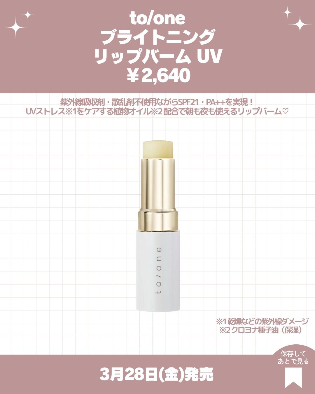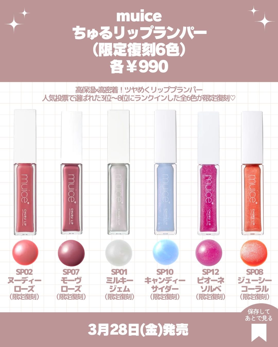 話題の新作コスメ最新情報まとめ~!こんにちは!kumasakuです🐻@ckumacom▲過去の投稿はここからチェック!今回も新作コスメの最新情報をまとめて紹介します!保存して欲しい新作コスメを見逃さないように🐻【ご紹介アイテム】■3月15日(土)発売→ダイアンボヌール(DianeBonheur)・ドライシャンプー(アイシナモロール限定パッケージ4種)120mL各¥1,518ブルージャスミン&ミントの香り(限定デザイン)スノーローズの香り(限定デザイン)微香タイプ(限定デザイン)ピーチティーソルベの香り(限定デザイン)・シャンプー&トリートメントジャスミンブルーの香り(アイシナモロール限定パッケージ)500mL×2¥2,618■3月28日(金)発売→CipiCipi(シピシピ)・ブリンブリンハイライター(限定1色)¥1,540101ピンクオーラ(限定色)・ポアレスチーク(全3色)各¥1,43001バニーピンク02スワンラベンダー03デイリーピーチ→to/one(トーン)・ブライトニングリップバームUV¥2,640→muice(ミュアイス)・ちゅるリップランパー(定番化2色・限定復刻6色)各¥99005ショコラフォンデュ(定番化)06ラズベリーショコラ(定番化)SP02ヌーディーローズ(限定復刻)SP07モーヴローズ(限定復刻)SP01ミルキージェム(限定復刻)SP10キャンディーサイダー(限定復刻)SP12ピオーネソルベ(限定復刻)SP08ジューシーコーラル(限定復刻)次回も話題の新作コスメの最新情報などご紹介しますのでお楽しみに!------------------------------------※画像はLIPS様よりお借りしました。#新作コスメ#コスメ情報#コスメ紹介#プチプラ#プチプラコスメ#プチプラ新作#ドラコス#ドラコス新作#バズ#バズコスメ#バズりコスメ#パケ買い#パケ買いコスメ#春コスメ#新作#新色#おすすめ新作#春メイク#ピンクメイク#リップ#リップスティック#プランパー#リッププランパー#ティント#ティントリップ#グロス#リップグロス#チーク#ブラッシュ#血色感#ヘアケア#シャンプー#コンディショナー#ドライシャンプー#キャラコスメ#コラボコスメ#ベースメイク#ハイライター#ラメ#チーク#ブラッシュ#白みピンク#白みカラー#リップバーム#UVケア#限定復刻#定番化#ドラスト#ドラッグストア#ドラストコスメ