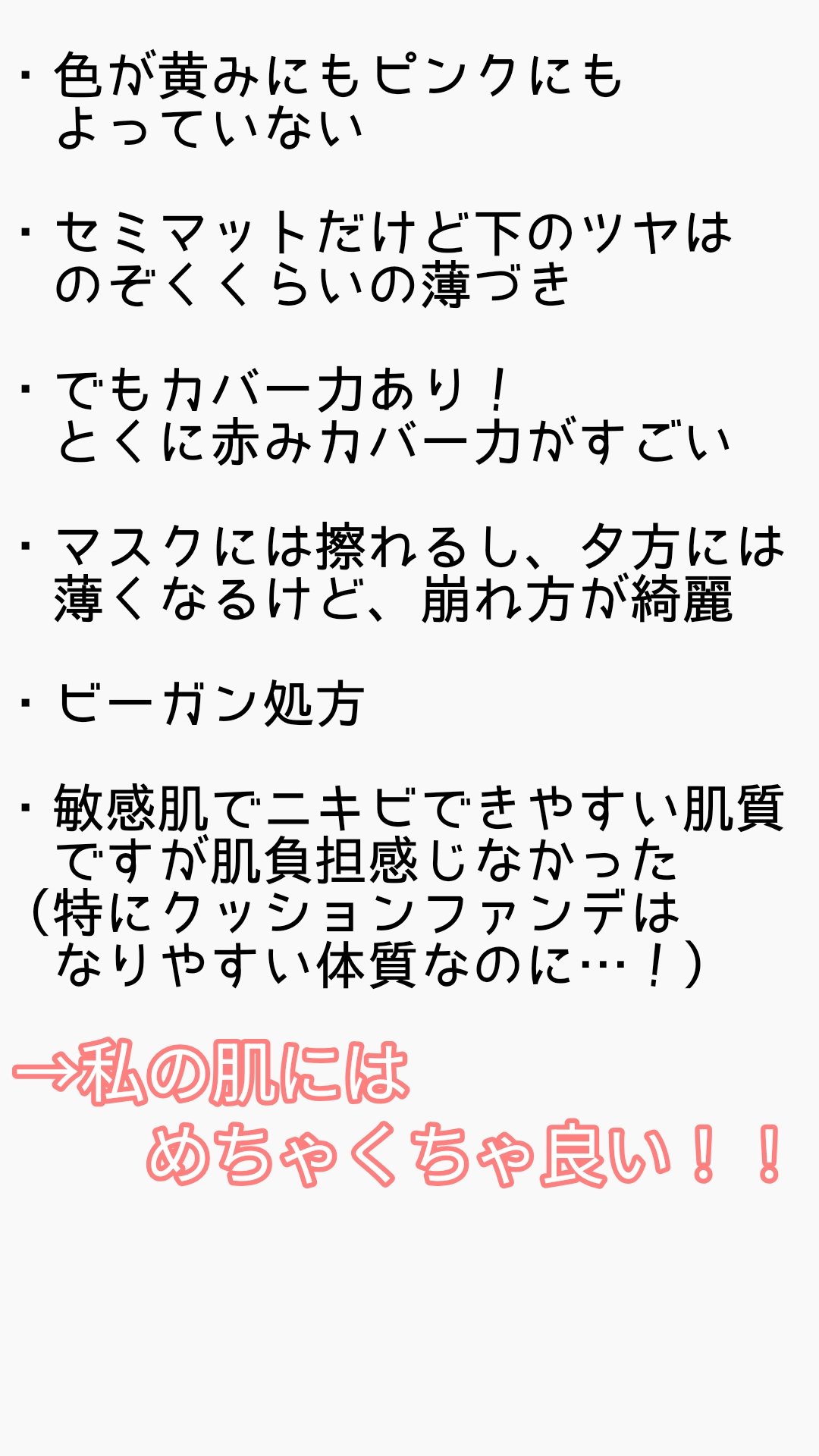 メガ割にて、あまりの可愛さにパケ買いしてしまったクッションファンデーション(•ө•)♡普段17号〜19号のファンデーションを使用していますがこちらは1号のお色を使って肌よりちょっと明るいくらい。私は首の方が白いので、ちょうどよい色味でした。パケ買いだったけど、中身も素晴らしい…!セミマットだけど下のツヤが見えるくらいの透け感がありつつもカバー力もしっかりあります。特に赤みカバー力がすごい!黄みにもピンクにもよらないお色で、コンシーラー使わずとも赤みが隠れます!!でも厚塗り感はなく、元から肌が綺麗なんですーみたいな感じになります✨夕方になると薄くなっていくけれど、汚い崩れ方ではないです!毛穴落ちしたりテカったりしやすい肌なのに、ほとんどなかった…😆!ヴィーガン処方で、肌に合わないとニキビができたりする敏感肌な私(クッションファンデーションは特になりやすい(;_;))でも、肌負担感じずに使えているのも推しポイント✨私の肌的には今までで1番良かったクッションファンデーションです…!!個人的な意見にはなりますが誰かの参考になったら嬉しいです♪#Qoo10メガ割