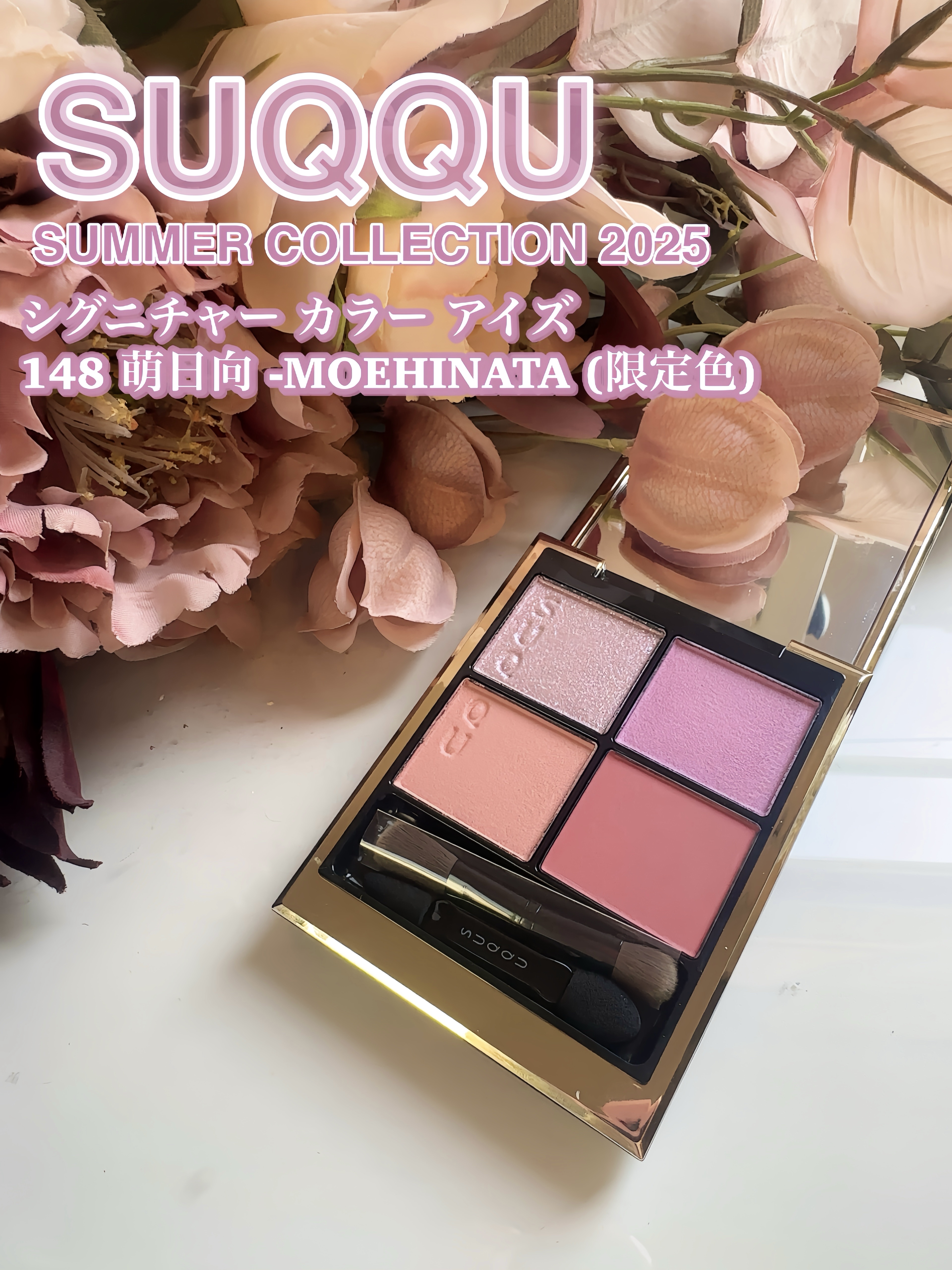 SUQQUSUMMERCOLLECTION2025👒//·.⟡┈┈┈┈┈︎✧┈┈┈┈┈⟡.·SUQQUシグニチャーカラーアイズ148萌日向-MOEHINATA(限定色)¥7,700ブラーリングカラーブラッシュ110日差色-HISASHIIRO111比彩-HIIRO¥6,600·.⟡┈┈┈┈┈︎✧┈┈┈┈┈⟡.·2025.5.2日発売夏の光と影が織りなす陰影、静と動のコントラストがテーマの『SUQQU2025年サマーコレクション』瞳の奥に色濃く残る夏の景色の余韻をメイクで纏う今しかないこの季節を存分に楽しもう。.*·.⟡┈┈┈┈┈┈┈┈┈⟡.·*.光と影のコントラスト、色褪せたカラー。夏の日の情景をまぶたに映して。くすみ感のあるコントラストカラーをひとつに。"シグニチャーカラーアイズ"【148萌日向-MOEHINATA(限定色)】〔ウォッシュドピンク✕バーントピンク〕褪せたようなウォッシュドピンクに赤みの強いバーントピンクを合わせシルバーとパープルのパールのアクセントに。ノスタルジックでセンシュアルな印象の元に仕上がるパレット。ふわっとした血色感、映る光のコントラストで、太陽と戯れたかのような頬に。〔やわらかな血色感を宿すチーク〕と〔夏の光を集めるシマーなハイライター〕で、光と影の美しい対比をグラフィカルに表現したブラッシュ。上品な艶感がふわりと頬を彩り、ブラー効果で美肌を演出する。"ブラーリングカラーブラッシュ"【110日差色-HISASHIIRO(限定色)】〔サニーオレンジ✕シュガーピンク〕ヘルシーな血色感を添えるベージュオレンジのチークにやわらかなピンクパールの艶を与えるハイライター。【111比彩-HIIRO(限定色)】〔ブライトピンク✕シマーライラック〕夏の日の多幸感を感じられる青みのブライトピンクのチークと、シアーな質感で光を集め、みずみずしさを放つハイライターのセット。肌の透明感を引き出し、高揚感のある頬に✧*。夏らしさ全開のカラーで一目惚れしたコレクション。発売を知った時に絶対欲しい!と思っていたので抽選販売で購入できてすごく嬉しい(◜𖥦◝)カラーの見た目は明るめだけど、お肌にのせると落ち着いた発色とラメ&パール感で肌馴染みがよく合わせやすい。特にブラッシュは特別なデザインが激可愛い💓全体的にピンク系が入っていて初夏の温かさを感じます𓈒𓋜ピンク好きにはたまりません🥰ご参考までに𓂃⟡.·#SUQQU#シグニチャーカラーアイズ#萌日向#ブラーリングカラーブラッシュ#日差色#比彩#フォロバ100#はじける果実感コスメ