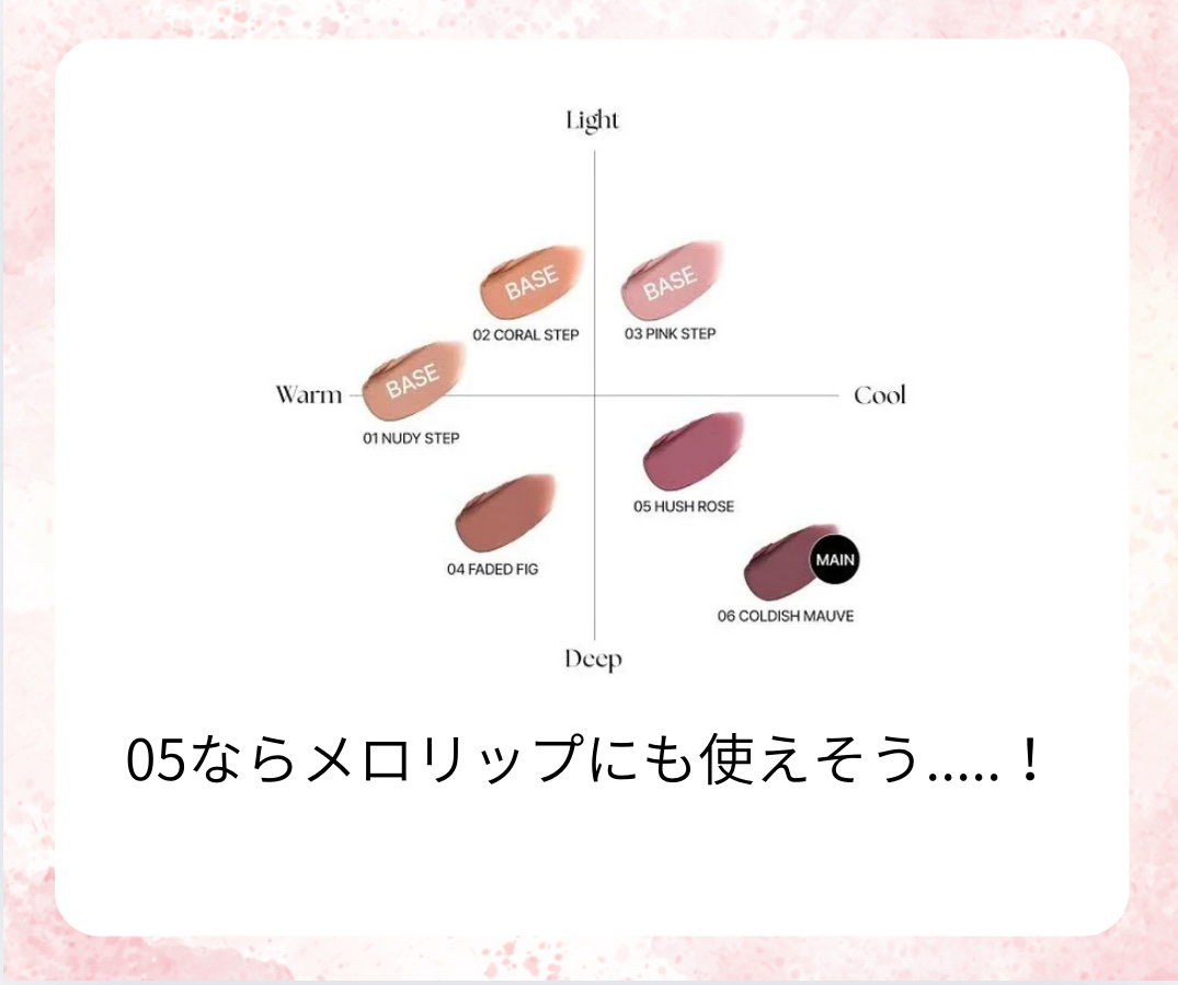 - パーソナルカラーを考え抜いた、すべてのトーンにしっかりフィットするリップベース。