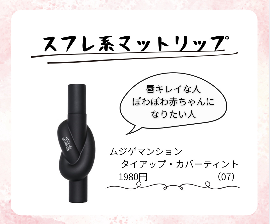 ムジゲマンション タイアップ・カバーティント07パケが好みすぎて衝動買いしちゃった商品まるでスフレのようなマットリップ!赤ちゃん?ってくらいふんわりするの💖💖唇の色が濃い私でもそのまま発色✨️ティントじゃなかったらチークに使いたいくらいぼかしやすいし、ふわふわに見えるから秋メイクにもいいかも!ただ泥リップ系?だから唇のシワに入り込みやすかったりガサガサ感が際立っちゃったりした😭唇のコンディションいい日は超かわいいのに!てことで、唇キレイな人、ふわふわ赤ちゃんになりたい人はぜひ!!かなりムラになりやすいけど、塗ったあとにスポンジでぽんぽんすると解決♪ただそれでも唇のコンディションに結構左右されるから注意⚠️#プチプラコスメ#リップ#秋の先取りコスメ#マットリップ#ティント