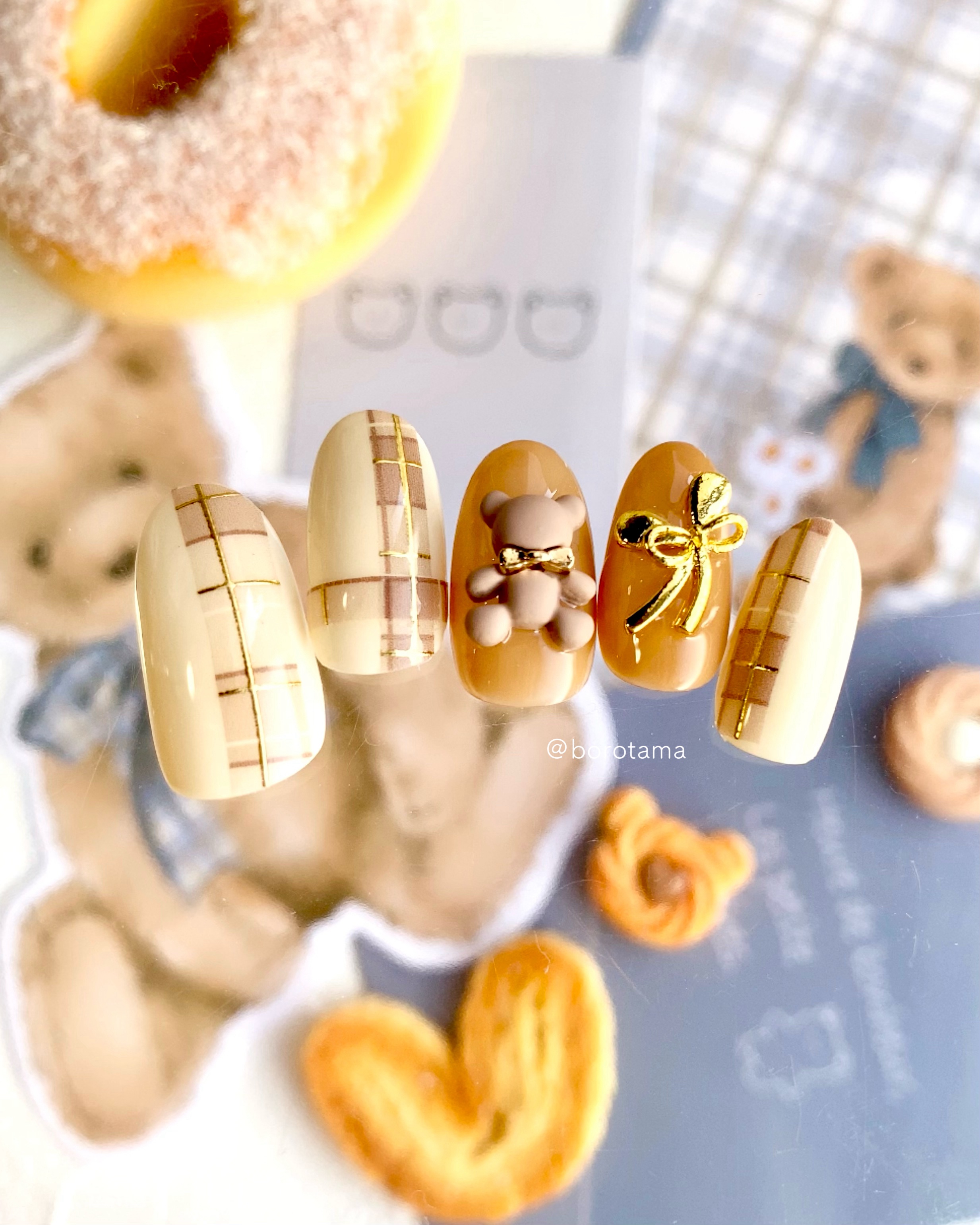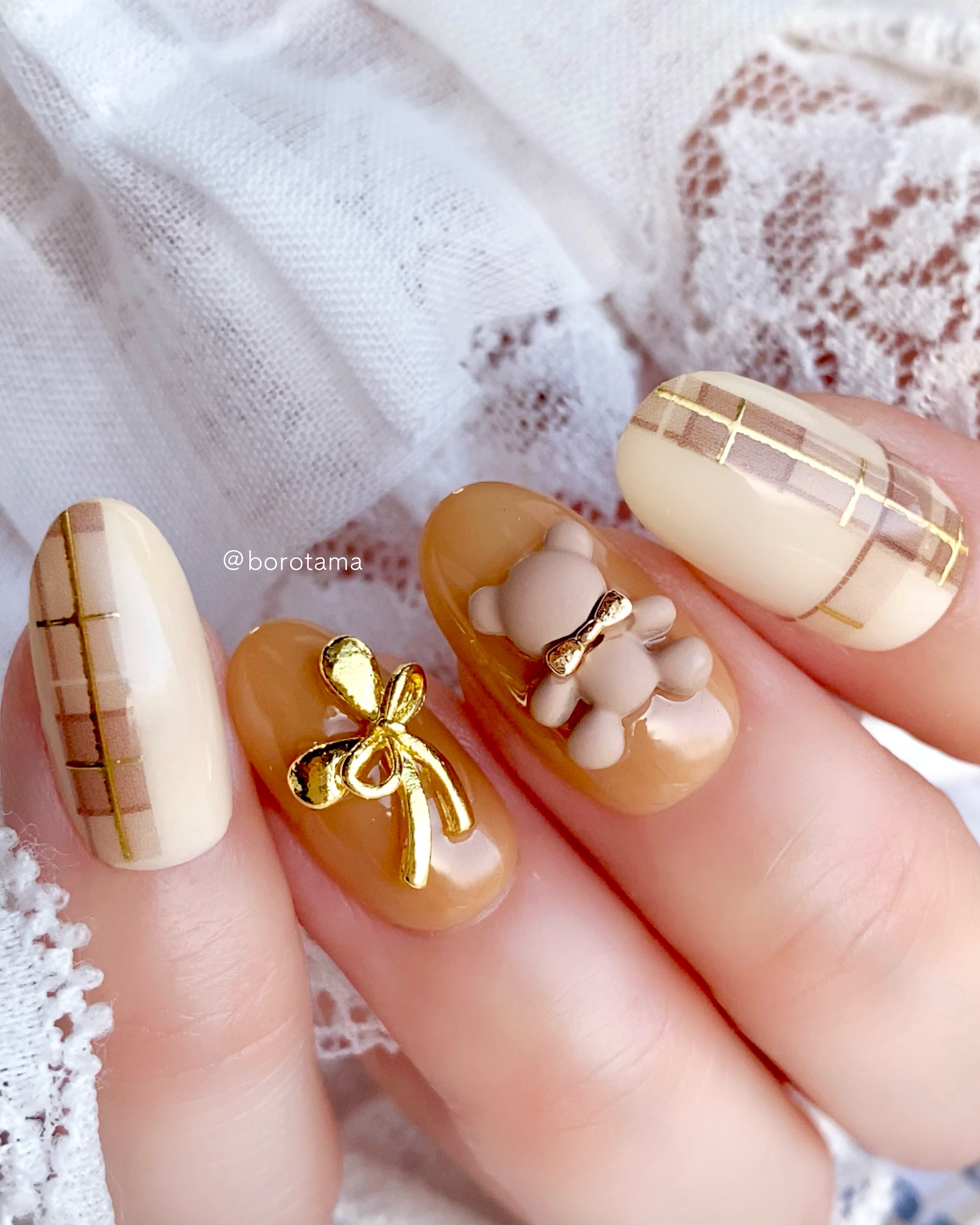 プチプラで作る🤎キャラメルくまさんネイル🧸ネイルホリックのBR027Fこっくりキャラメルみたいで美味しそう😋今日はSeriaで買ったクマちゃんやネイルシールと合わせてみました〜!Seriaのシールとパーツがすっごく可愛い💞描くのが難しいチェックネイルもシールを使えば簡単なのでぜひ試してみてね✨********************♡使ったもの♡♡#ネイルホリックつめ用ファンデ+440円(税込)・ネイルホリックつめ用ファンデ+BR027F♡#ちふれネイルエナメル440円(税込)・ちふれネイルエナメル020♡#Seria(#セリア)各110円(税込)・フィックスグロッシートップコート・ネイルシールチェックJAN:4968583253175・ネイルパーツ変形りぼん5PJAN:4539314535435・ネイルパーツミニベア2PマットカラーJAN:4968988230221********************♡作り方♡作り方は写真を参考に📸①ベースカラーを塗りよく乾かす⚠乾いてないとシールを貼ったときにヨレやすいので注意!!②シールを細めに切る③シールを隙間ができないようにしっかりと貼り付ける④トップコートを塗れば完成✦💡私的には縦、横に重ねて貼る場合は2本のシールの大きさを太めと細めにしておくと可愛く見えてオススメ✨********************Seriaのマットな質感のクマちゃんパーツ可愛い〜🧸前回投稿したフロッキータイプと迷いましたがネイルホリックのキャラメルカラーとの相性が良さそうだったのでこっち使ってみました😉他にも可愛いパーツいっぱい出てたのでぜひ好きなアイテムですやってみてね💓#ネイル#セルフネイル#プチプラネイル#簡単ネイル#秋ネイル#冬ネイル#100均ネイル#セルフネイル初心者#ポリッシュ派