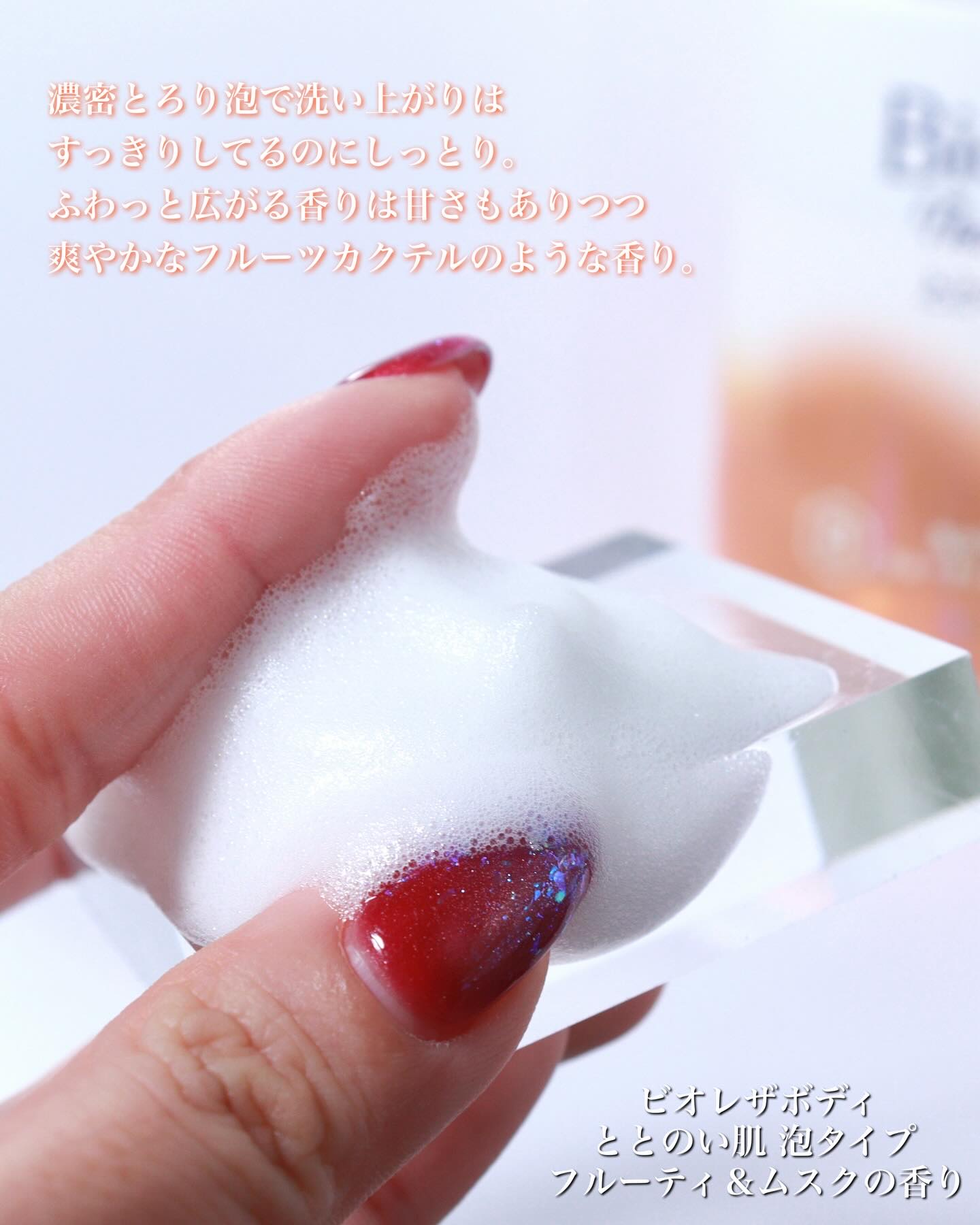 .♡♡ビオレザボディととのい肌泡タイプフルーティ&ムスクの香り♡♡Xで話題になっている商品だったので、興味津々で使用してみました❤1プッシュ手に取り出しただけで、とても濃密でクリーミーな泡が出てきます。泡の量も多めでヘタリにくい泡なので、比較...