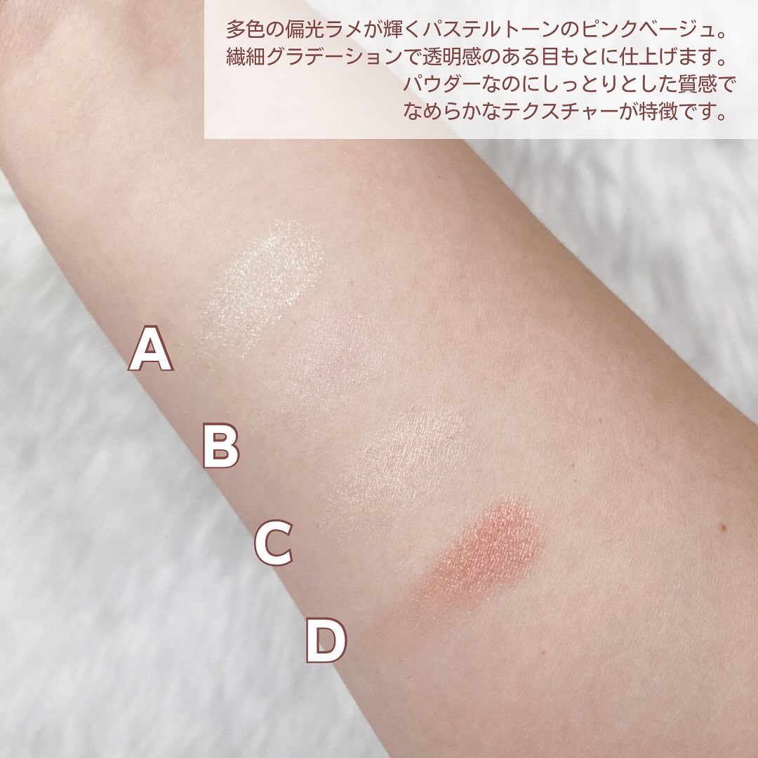 - 今年の春、限定色として登場したキスミー フェルム スタイリングアイパレットの大人気カラー「オーガンジーピンク」がご好評につき定番化決定! 多色の偏光ラメを贅沢に使用配合したパステルトーンのピンクベージュグラデにより透明感がUP。 瞬くたびに光がゆらめく透明感のある目元を演出します。 多色の偏光ラメが輝くパステルトーンのピンクベージュ。 繊細グラデーションで透明感のある目もとに仕上げます。 まぶたに溶け込むような繊細グラデで奥行きのある目元へ ●しっとりなめらかなテクスチャー モイストプレス製法 パウダーなのにやわらかくしっとりとした質感を実現。まぶたに上品なツヤをもたらします。 ●目元を立体的に引き立てる シェードカラー設計 質感の異なるクリアラメ、トーンカラー、ディープカラーで構成されたこだわりの4色を配置。 重ねてもくすみにくい発色でまぶたに陰影をもたらし、目元を立体的に演出します。 ●まぶたに密着して美しい仕上がりが続く 高密着フィット処方 時間がたってもヨレや粉落ちしにくく、美しい仕上がりが続きます。 ●うるおい美容液成分配合 ヒアルロン酸・コラーゲン・ローヤルゼリーエキス・カミツレエキス