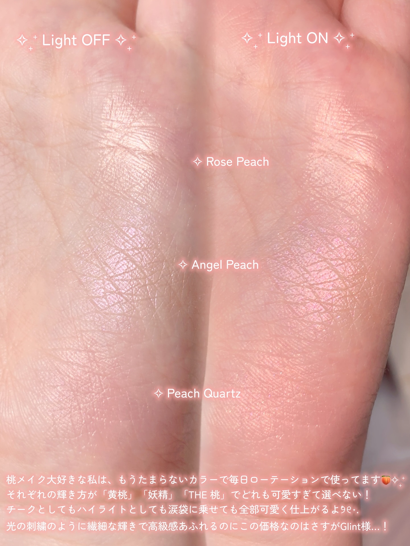 ┈┈┈♡これはもう、“桃色の幸せ”を肌に宿す魔法。ついに出会ってしまった、フェアリーピーチビーム𓂃𓈒𓏸┈┈┈♡Glint(@glint_official_jp)から出た新作ハイライター「FairyPeachHighlighter」が本当に可愛すぎて……かなりテンション上がったアイテム𖤐˒˒@lgbeauty_jp今回は⟡RosePeach⟡AngelPeach⟡PeachQuartzの3色を全て試してみました⸝⸝☑頬骨や鼻筋にのせると、 光の粒がふわっと溶け込むような艶。☑微細パールなのにギラギラ感なし。 角度によってツヤが透けるような質感が上品すぎる𓈒𓏸☑指でもブラシでもつけやすくて、ムラにならない◎そして何よりこの”ピーチ感”……肌にのせるとほんのり色づいて、チークや涙袋にも使いやすいマルチさも嬉しいポイント♡──各カラーの印象をまとめると……✐☡✧RosePeach⤷上品で華やか、それでいてやさしい発色✧肌にロージーな深みを与えてくれるから、大人っぽいピンクツヤが好きな方に。頬にふわっと広めにのせると、ドレッシーな雰囲気に♡✧AngelPeach⤷まるで妖精が舞い降りたみたいな透明感✦淡く柔らかいピンクベージュで、ナチュラル系ハイライトを探してる方に◎肌がふんわり明るく見える感じが好きな方に推しです♡✧PeachQuartz⤷見た瞬間に「これ絶対好きなやつ…!」って思った1色。コーラル感のあるピーチカラーが愛らしくて、血色×ハイライト×涙袋と万能な1色◎「桃メイク好きさん」はまずこれを手にとってほしい♡どの色も本当に繊細で、ツヤというより“光が通るフィルター”をまとったような仕上がりに近い印象𓈒𓏸ナチュラル派にも、しっかりツヤ感派にもどちらにも寄り添ってくれるバランス感が、さすがGlintさん……!と思いました。ここまで質感が綺麗なのは嬉しすぎる!これはリピート確定アイテムでした𖤐˒˒気になる方は、ぜひチェックしてみてくださいね♡┈┈┈♡フェアリーピーチビームで、頬にしあわせをのせよう。┈┈┈♡#Glint#LGbeauty_ip#グリント#ハイライト#ハイライター#発光ハイライター#韓国コスメ#桃コスメ#桃メイク#韓国コスメ#韓国コスメ好きな人と繋がりたい#Qoo10#コスメ#Qoo10メガ割#メガ割おすすめ#メガ割