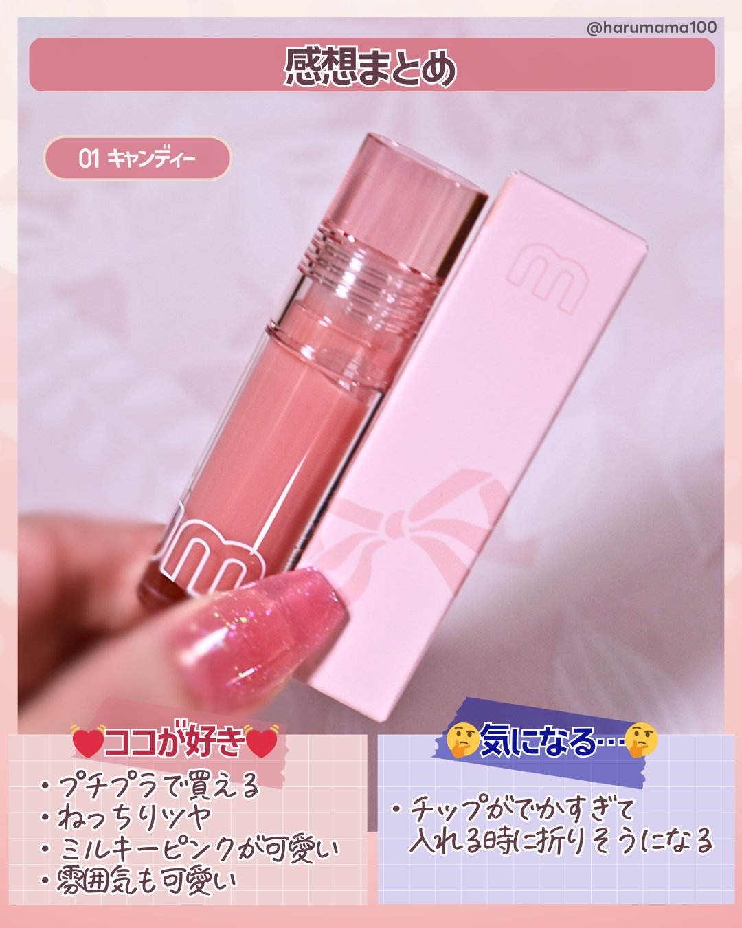 【プチプラで叶う♡バブい艶リッププランパー】───────────────minumミニュムバブリッププランパー01キャンディー参考価格770円(税込)───────────────プチプラで買える可愛いコスメ「ミニュム」のプランパー♡ほんのりスースーする感じかな~。キャンディーコーティングみたいなテクスチャーがねっちりツヤツヤに見せてくれるの♪私が選んだ「01キャンディー」のカラーはほんのりミルキーピンクの透ける発色。唇の色味をちょっぴり抑えてくれるよ〜。地色のカバー感はないんだけど、逆にグラデっぽく見えて可愛い🥹ボテッと大きめのチップも塗りやすくて好き…でも出し入れしにくくて折れ曲げちゃいそうなのは注意かも〜?!───────────────#コスメ購入品#내돈내산#minum#ミニュム#リップメイク#リップ#プランパー#ツヤリップ#プチプラ#ドラコス#保湿ケア#lip#マル秘爆盛れ自撮り術