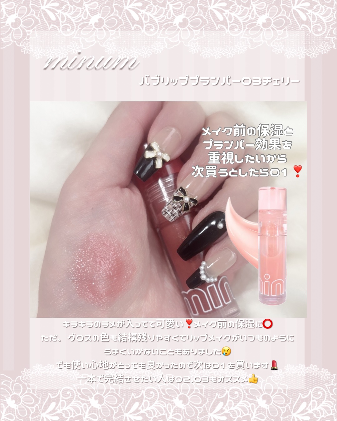 ꫛꫀꪝ!minumから新作が登場🥹🤍୨୧୨୧minumミニュムバブリッププランパー01キャンディー02プラム03チェリー¥770ミニュムメルティ涙袋ライナー00ヌーディー01シャイニーベージュ02シャイニーピンク¥704୨୧୨୧是非チェックし...