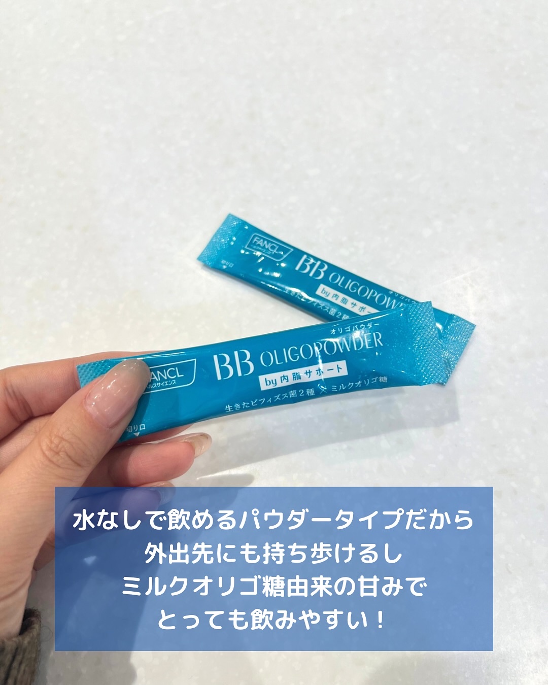 ⋆.ೃ࿔*:・@fancl_officialファンケル「BBオリゴパウダーby内脂サポート」<機能性表示食品>が4月17日に新発売するという事でFANCLさんのBBオリゴパウダー by内脂サポート新製品発表会にご招待頂き参加してきました!生きた善玉菌を補うだけじゃなくて善玉菌を腸内で育てる"シンバイオティクス"に着目して開発されたこのサプリがあれば心強いよね!!4月17日(木)に発売されるファンケル「BBオリゴパウダーby内脂サポート」<機能性表示食品>【機能性表示食品】10日分1,747円(税込)30日分4,980円(税込)生きたビフィズス菌を守るためにコーティングしているんだって!水なしで飲めるパウダータイプだから外出先にも持ち歩けるしミルクオリゴ糖由来の甘みでとっても飲みやすい!飲み方としてはそのままでも冷やしてもヨーグルトに混ぜるのもおすすめ!販売場所:通信販売、直営店舗#PR#BBオリゴパウダー#内脂サポート#腸活#インナーケア#ファンケル#いつの間にか脂肪【届出表示】本品には生きたビフィズス菌BB536(B.longum・B3(B.breve、ラクチュロースが含まれます。生きたビフィズス菌BB536(B.longum・B3(B.breveは、BMIが高めの方のおなかの脂肪腹部内臓脂肪、腹部総脂肪を減らす機能、高めのBMIを改善する機能が報告されています。ビフィズス菌BB536(B.longumは、大腸の腸内環境を改善し、便秘気味の方の便通を改善する機能が報告されています。ラクチュロースは、腸内細菌叢腸内フローラ中の善玉菌ビフィズス菌を増やし、腸内環境を改善する機能が報告されています。【機能性表示食品についてのご注意】*本品は、特定保健用食品と異なり、消費者庁長官による個別審査を受けたものではありません。*疾病の診断、治療、予防を目的としたものではありません。*食生活は、主食、主菜、副菜を基本に、食事のバランスを。
