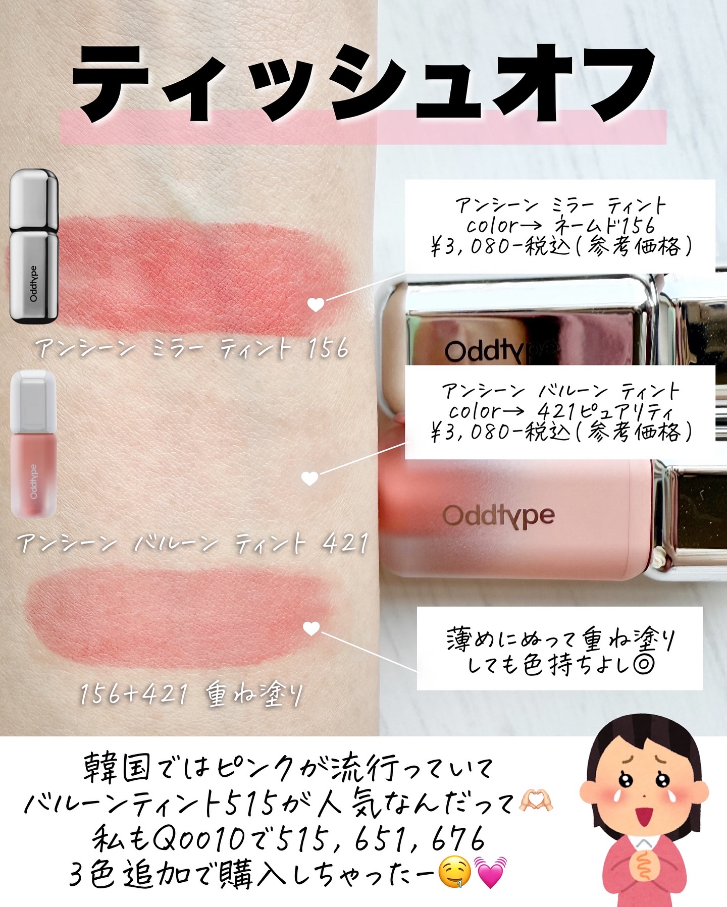 💡Oddtype💡アンシーンバルーンティント421Purity今回のメガ割で届いたOddTypeのティント。つけた瞬間、大好きでリピしてるちふれのリップティントに似てる!と思ったので比較。■色味ちふれ よりコーラルOddtypeよりピンク腕だ...