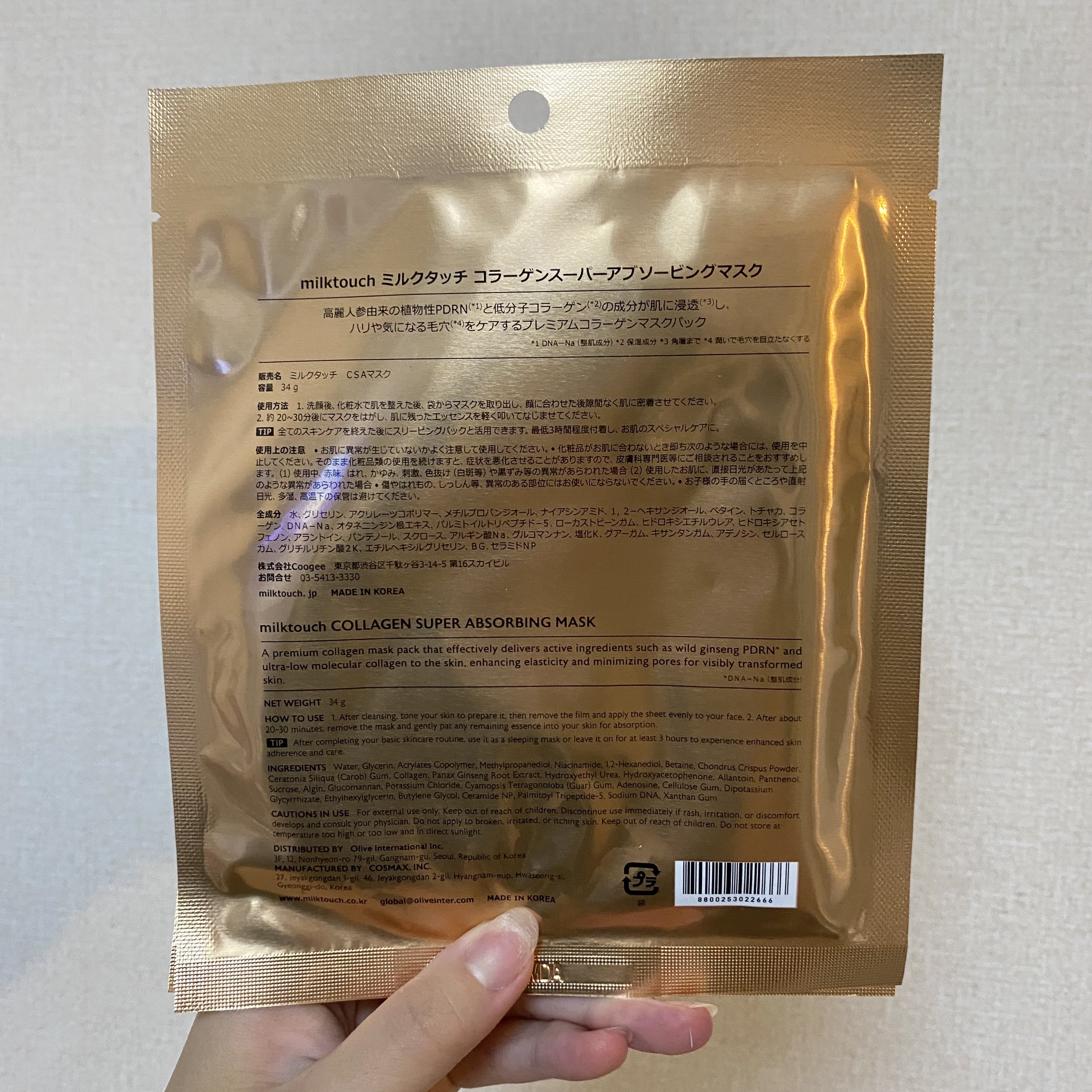 MilkTouch コラーゲンスーパーアブソービングマスク4枚入りミルクタッチさまからいただきましたMimiBeautyガチモニター企画での当選品です。ありがとうございます!!高麗人参由来の植物性PDRN※1と低分子コラーゲン※2の成分が肌に...