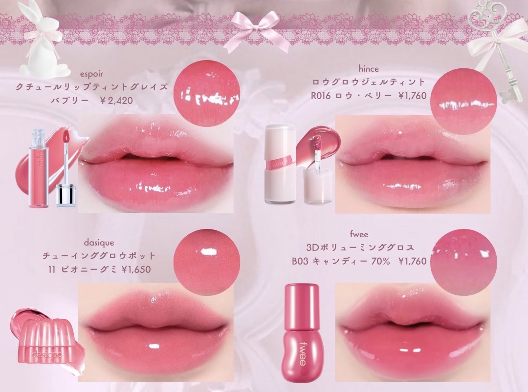 ❤︎推しリップ(韓国コスメ編)グロス➸fwee3dボリューミンググロスmilktouchデューステインシアーリップグロスどちらも軽めではないですが、重たすぎず、発色も綺麗◎私は重ね塗りというより塗り直しに使用することが多いです🫶ティント1➸色が長持ちしつつ乾燥もしにくい厳選リップ👑dasiqueジューシーデューイグロウティントespoirクチュールリップグレイズpytゲンバリップティントちゅるんと仕上がって、でもちゃんと色持ちも良い◎それでいて乾燥もしにくい...!ティント2➸時間が経つとツヤが増す系hinceロウグロウジェルティントlakaマキシグレイヤーティント2つとも、塗って少しするとツヤが増してくる不思議なティント🫶とにかくグロスいらずのみずみずしいちゅるリップに仕上げたい人に!!落ち方がより綺麗なのはlakaでしたദ്ദി˃ᵕ˂)色はブルベ夏の方におすすめですが、リップ自体はPC問わず参考にしてみてください♡︎ᵎᵎᵎ#laka#hince#dasique#pyt#milktouch#fwee#espoir#ブルベ夏#韓国コスメ#Qoo10#コスメ好き#リップ#韓国リップ