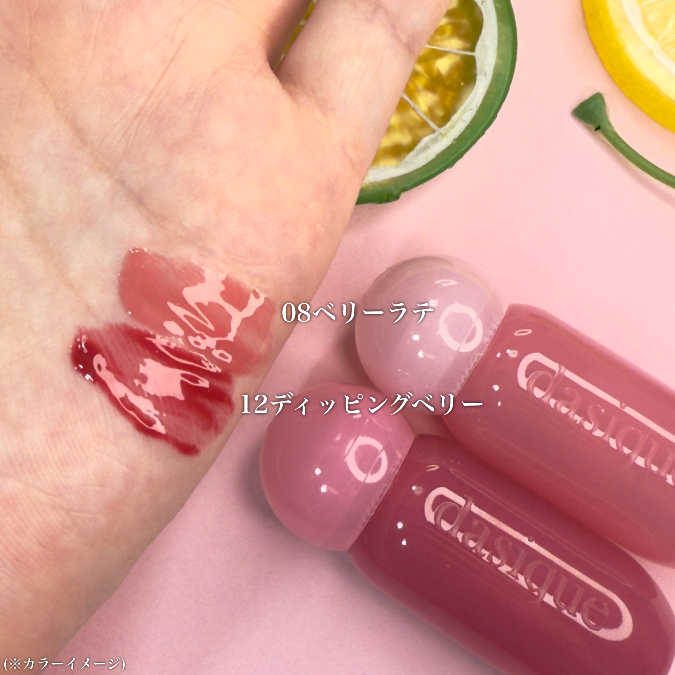 \果汁のようにみずみずしい唇へ/dasiqueジューシーデューイグロウティントミニ[08ベリーラテ・12ディッピングベリー]¥990(Qoo10調べ)唇に触れた途端、ぷるんと色っぽい果汁コーティング果物のようにぷるんぷるんとした唇を演出するグ...