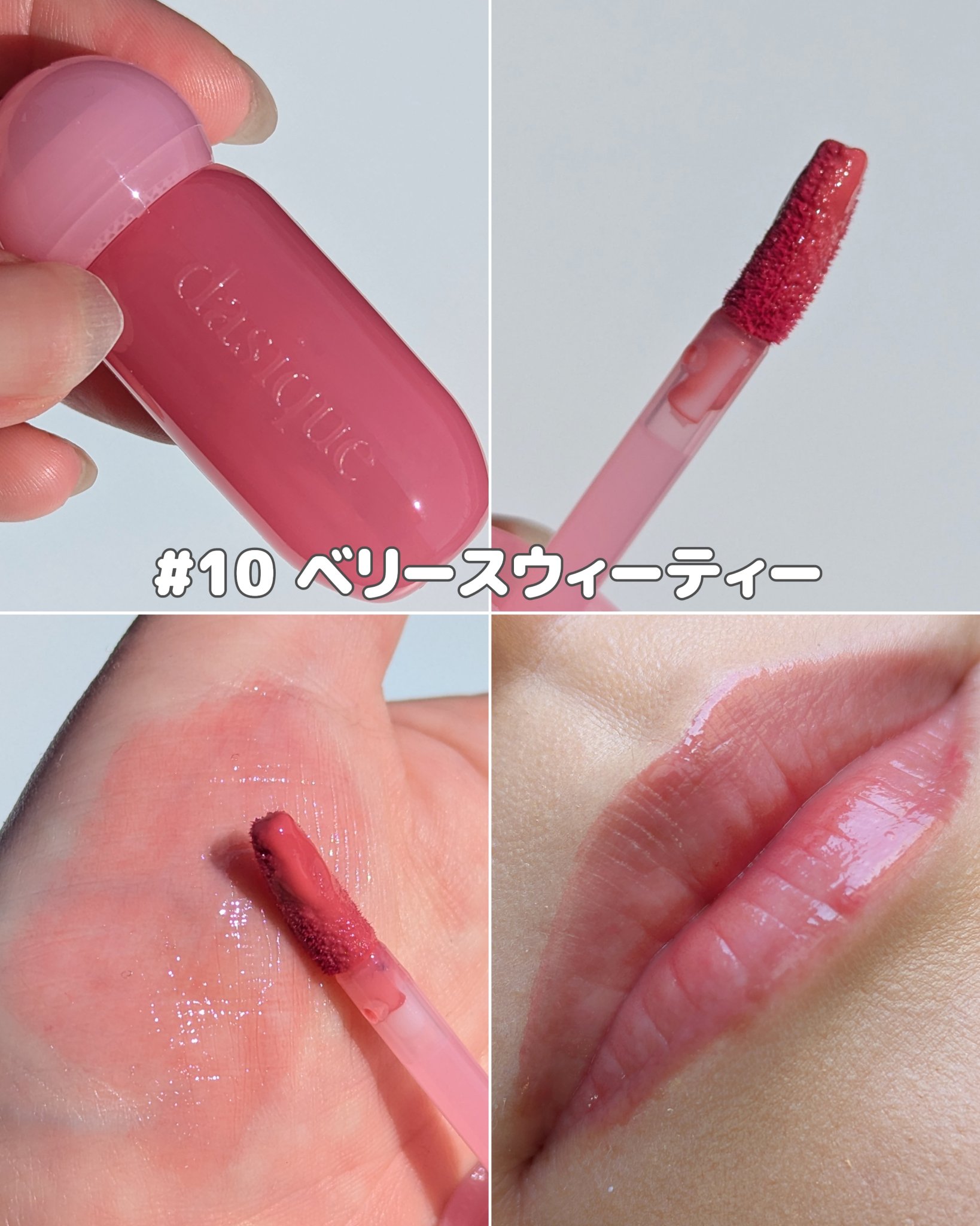 dasiqueから商品提供をいただきました。カラーは#10ベリースウィーティーを使いました。みずみずしいテクスチャーです。しっとりな使い心地で自分に合っていました。ベタベタしないで使いやすいです。コロンとした見た目で可愛く、手のひらにすっぽり...