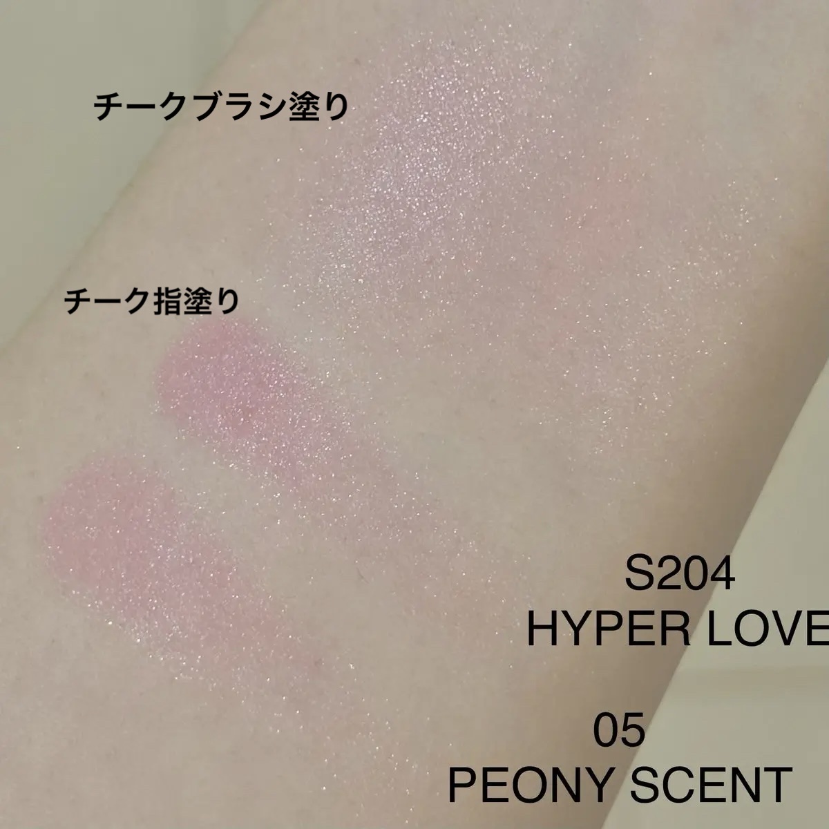 CLIOエッセンシャルシャドウタップ05PEONYSCENTCLIOエッセンシャルブラッシュタップS204HYPERLOVEアイシャドウ・粒子が細かい・粉飛びなし・シマーなラメ感で実際に使うとキラキラツヤツヤではない・つけすぎても厚ぼったくな...