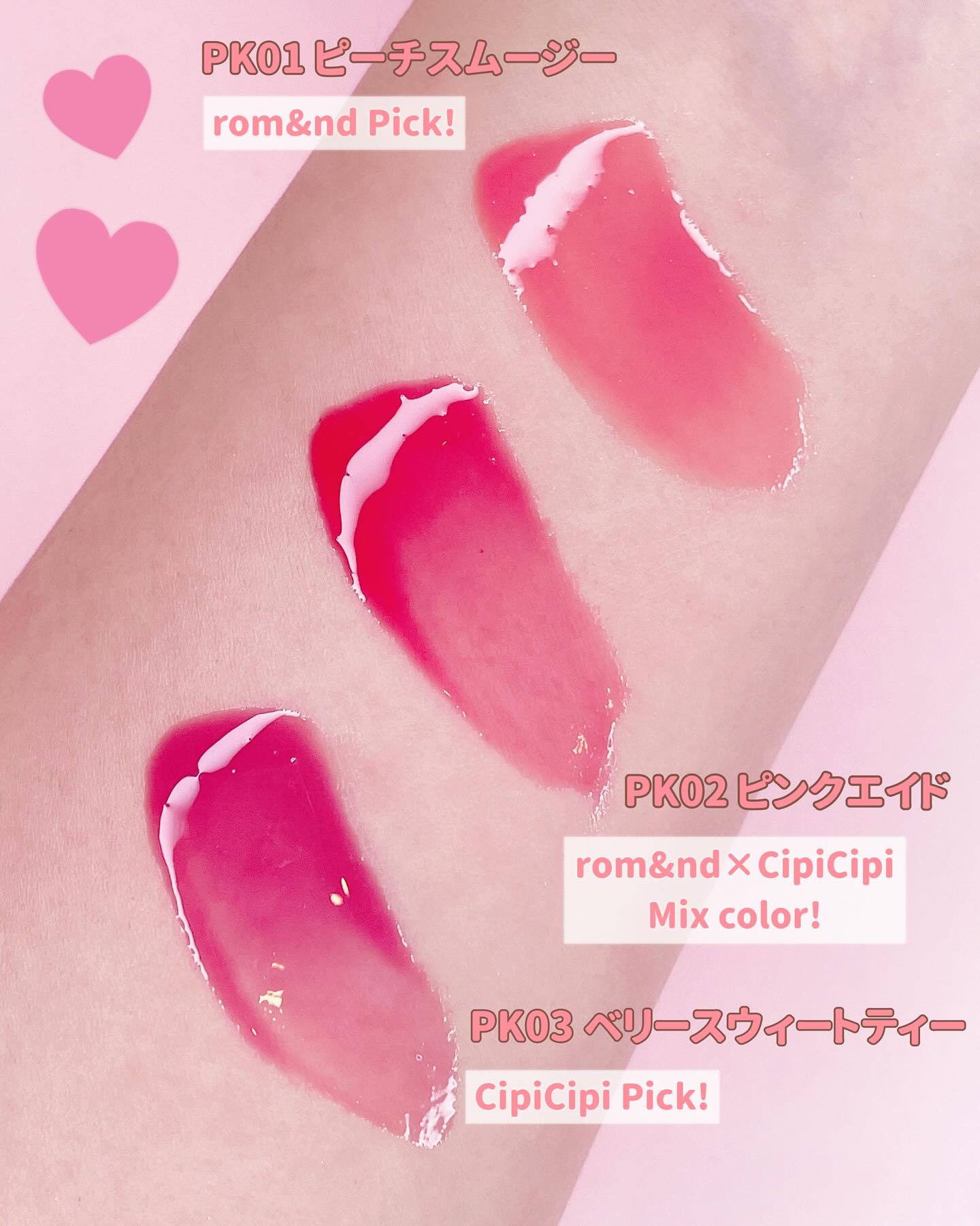 💄💋【rom&nd×CipiCipi】rom&Cipipopupにご招待いただきました!ピンクレシピがテーマの空間がとっても可愛くて、フォトスポットや特典も充実してるよ♪■レシピグロス(¥1,320)ガラス玉みたいなツヤぷるリップ!PK01~...