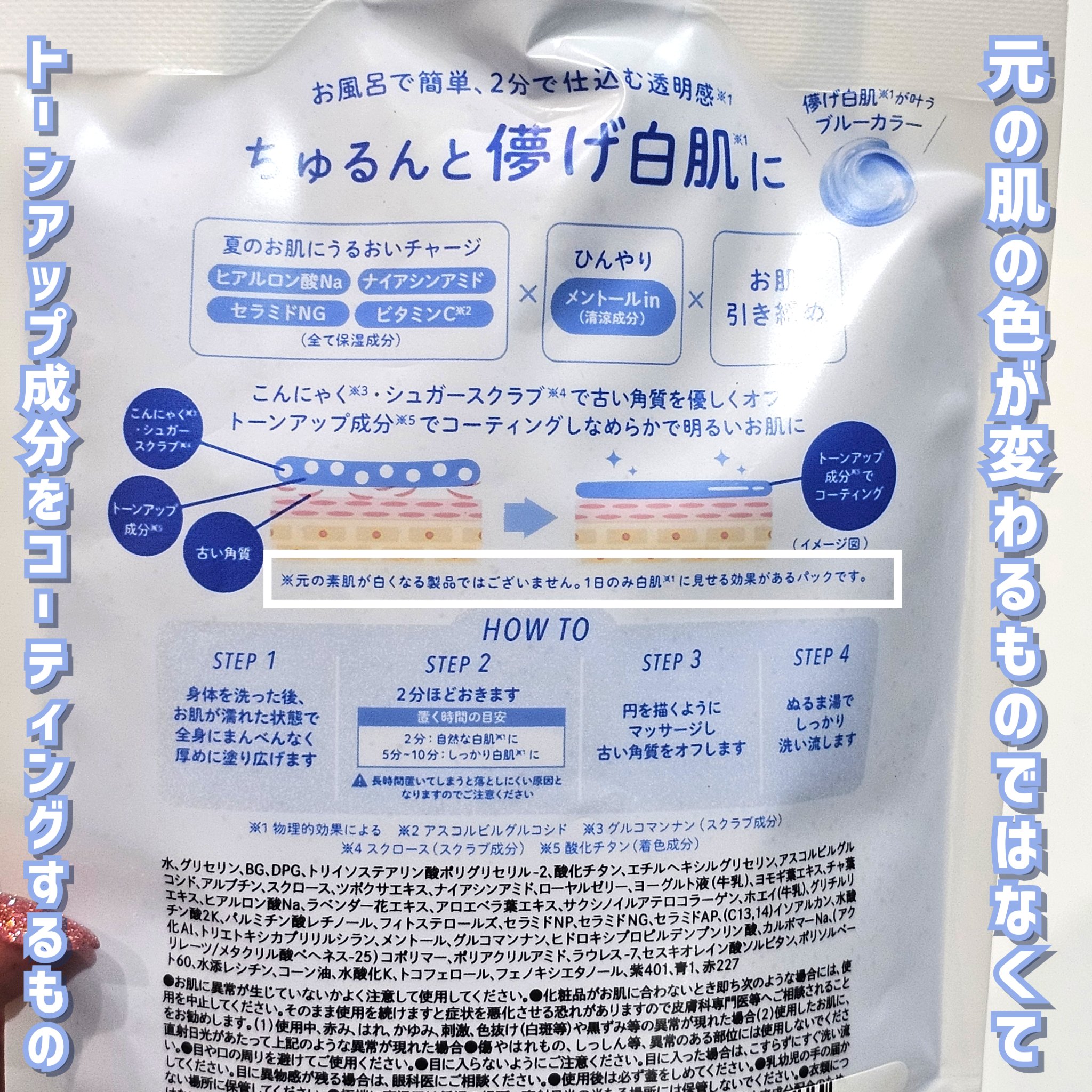 - 【数量限定】 \白肌感*1演出/ トーンアップしたい部分に塗って流すだけ! ボディ用洗い流しパック ひんやり お肌ひきしめタイプ 2分で仕込む透明感*1 #儚げ白肌パック*1 【商品POINT】 ①肌トーンを補正し儚げ白肌*1が叶う仕組み こんにゃく*2・シュガースクラブ*3で くすみの原因となる古い角質を優しい使い心地でオフ × トーンアップ成分*4で表面をコーティングすることで ワントーン明るい印象の儚げ白肌*1を演出 <BLUE> 『透けちゃうほどクリアな儚げ白肌*1』仕上げ こだわりのミルクブルーカラーで 全身のくすみや赤みをカバーしながらトーンアップ*1 ✓全身トーンアップしたい方 ✓海やプールの前日やお泊りの日に ✓乾燥によるくすみ・赤みが気になる方 ✓クールトーンのお肌になりたい方 ✓ごわついたお肌を優しい使い心地で角質ケアしたい方 ②こんにゃく*2×シュガースクラブ*3で角質ケア お肌のことを考えた天然由来のスクラブを配合 全身の古い角質をオフし、 ごわついたお肌を柔らかくなめらかに整えます ③夏の乾燥したお肌にうるおいチャージ ヒアルロン酸Na・セラミドNG・ナイアシンアミド・ビタミンC(アスコルビルグルコシド) などの美容保湿成分94%配合(全て保湿成分・水含む) ④ひんやりクーリング感 メントール配合(清涼成分)でほてったお肌にひんやり感 ほんのり冷たい使用感でお肌ひきしめ *1 物理的効果による *2 グルコマンナン(スクラブ成分) *3 スクロース(スクラブ成分) *4 酸化チタン(着色成分)