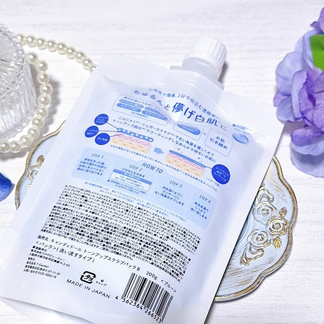 【肌が1日白く染まって疑似白肌になれると聞いたけど…白くならんぞ?!】◎CandyDoll トーンアップスクラブパックB ブルーブランドリニューアル前からあるトーンアップクリームパックですが、恥ずかしながらリニューアル後に初めてこの存在を知り...