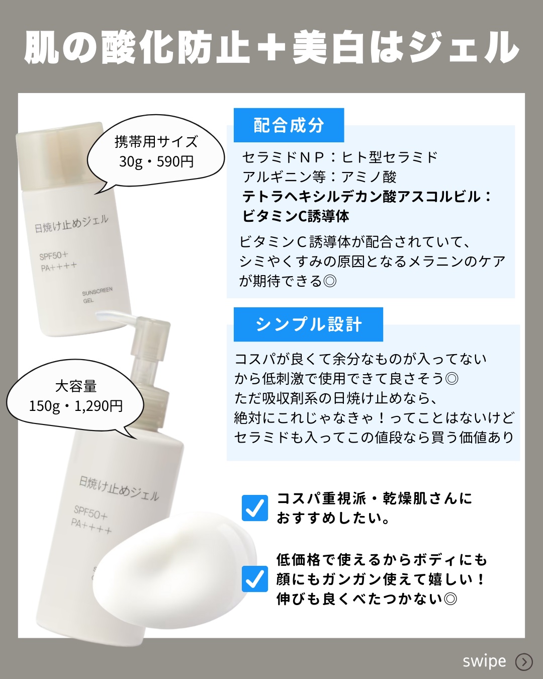 \無印の新作日焼け止め!徹底解説!/最近バズってる無印の日焼け止めについて解説します🐒150ml・1,290円と超コスパの無印の日焼け止め👆低価格なのにヒト型セラミドに加え、美容成分もはいって、これはバズる理由も納得の商品😵💫👏ミルクタイプは紫外線吸収剤フリー+酸化亜鉛フリー+抗炎症成分配合と敏感肌にもってこいの成分構成!☀️個人的に散乱材タイプはどうしても白浮きが気になってしまうので、ジェルタイプの方が好きでした🥲💓大容量だからボディにもがっつり塗って紫外線対策していきましょう~💛#無印良品#無印日焼け止め#日焼け止め#uv対策