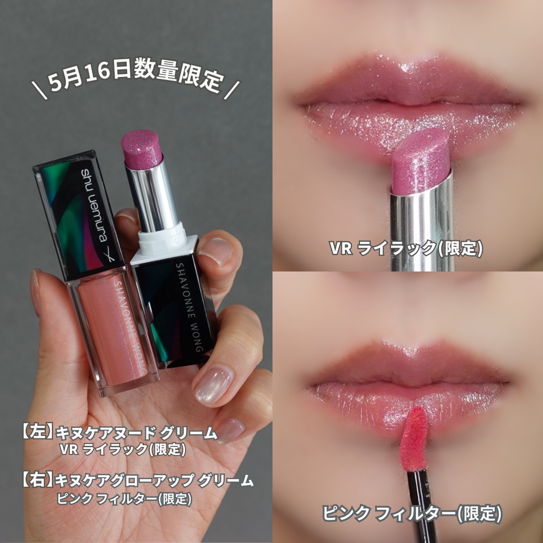 【shuuemura夏リップに激艶ライラック登場✨】パープル系おたく歓喜のコチラ💁-————————5月16日数量限定/《shuuemura》キヌケアヌードグリーム▪︎VRライラック(限定)5,060円(税込)-————————最近話題の“レフ板リップ“に近未来的な煌めきが詰まったライラックカラーが登場💄▪︎VRライラック(限定)ひんやりブルーな濡れツヤ纏う、神秘的なソフトライラック。透け感のあるライラックカラーに青パール入りのひんやりカラーが涼やか!“レフ板リップ“なるほど!なツヤ感で、スルスル〜と塗り心地も良く、青&銀パール効果で動くたびにパールが踊る爆光パープル系💜見た目はピンク感も感じたんだけど、塗るとツヤでトーン上がって白感が強くなるせいか血色感は微かに〜って感じ。本当、メタリックなツヤ感がすごい👏とにかく、蓋を開けるたび見た目の反則的な可愛さが異常です🥺同時発売のグローアップグリームのピンクフィルターも試してみたんだけど、塗ったら分からないくらいの偏光感でコーラルっぽさもあるピンクが甘可愛い🩷何やらコチラもパープル系があると聞いたのでまたお店に見に行ってみようと思います🏃♀️しかし、このシリーズ良い。塗り心地も良いし、ツヤ光で顔色もパッと明るくなる気もする☺️Giftedby@shuuemura#PR#シュウウエムラ#shuuemuraxshavonnewong#新作コスメ#限定コスメ#リップ#ブルベ冬#夏コスメ