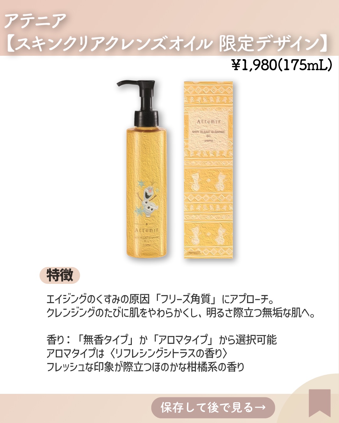 アテニア×アナと雪の女王限定パッケージ🩵2025年5月19日(月)数量限定発売#アテニア☑︎ドレススノーローション☑︎ドレスリフトローション☑︎スキンクリアクレンズオイルアテニアの人気スキンケアアイテムが「アナと雪の女王」の限定パッケージで登場!5月12日(月)からフルーツギャザリングの一部店舗(西宮店、青森店、新潟店、沖縄店、那覇店を含む20店舗)、5月14日(水)からアテニア阪神梅田本店、5月15日(木)から@cosmeSTORE(ルミネ横浜店、ルミネ池袋店、NEWoMan横浜店、ルミネエスト新宿店、ルミネ大宮店、ルミネ有楽町店)以上で先行販売も!よかったらお買い物の参考にしてください♡インスタもよろしくお願いします!Instagram▷▷ @pomi_cosme_#Attenir #限定 #限定パッケージ #化粧水 #クレンジング #クレンジングオイル #スキンケア #メイク落とし