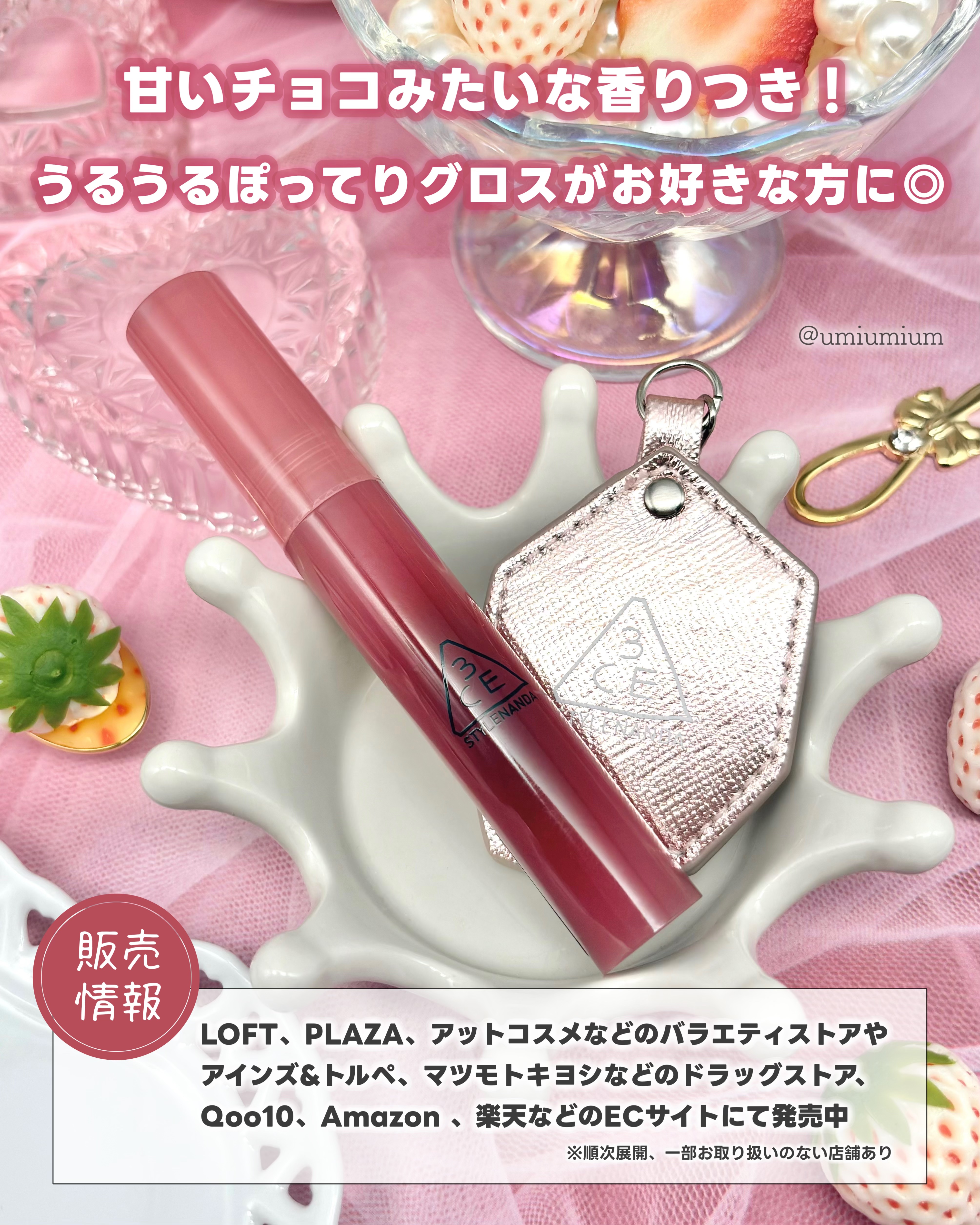 一目惚れして新色即購入!3CEのいちごラテグロスが可愛すぎ🍓🥛💕┈┈┈┈┈┈┈┈┈┈┈┈┈┈┈┈3CEドロップグロウジェルモーヴコール¥2,189(税込)┈┈┈┈┈┈┈┈┈┈┈┈┈┈┈┈こんにちは!うみかです!いつも♡📎フォローありがとうございます😊本日は3CEの大人気グロス新色が可愛すぎたのでご紹介。ロフトでなんとなく目に入ってテスター見て一目惚れして即購入🛒✨とろみジェルテクスチャーでぽってりうるツヤ唇に仕上がるリップグロス。購入したカラーは新色モーヴコール。まろやかなモーヴピンクで青みは強すぎずニュートラル寄りな色味。ナチュラルに血色感を与えてくれて肌馴染みも良くて可愛い…!ぽってりぷっくりした仕上がりで縦じわも気になりにくく感じました👏🏻💕グロスなので色持ちは良くないですがこの仕上がりの割にベタつきも少ないかなと。甘いチョコみたいな香りがします。そこまで強くないけど甘い香りが苦手な方は注意かな🤔しかもこのグロスを含めた新作コレクション、ピンククリスタルコレクション対象商品を1点以上購入でオリジナルミラーがついてきた✨※一部お取り扱いのない店舗あり、数量限定のため、プレゼントがなくなり次第終了キーホルダーとして使えて可愛い🫶🏻💕うるうるぽってりグロスがお好きな方は是非チェックしてみてほしい…!┈┈┈┈┈┈┈┈┈┈┈┈┈┈┈┈🛒販売情報・LOFT、PLAZA、アットコスメなどのバラエティストアやアインズ&トルペ、マツモトキヨシなどのドラッグストア、Qoo10、Amazon、楽天などのECサイトにて発売中※順次展開、一部お取り扱いのない店舗あり┈┈┈┈┈┈┈┈┈┈┈┈┈┈┈┈気になっている方のご参考に少しでもなりますと幸いです!その他Instagram投稿はこちらから!@umiumium7777ここまでお読みいただきありがとうございました😊#3CE#ドロップグロウジェル#韓国コスメ#韓国リップ#新作コスメ#新作#バズコスメ#バズリップ#Qoo10#メガ割#Qoo10メガ割#ピンクメイク#韓国#ツヤリップ#リップグロス#グロス#リップ#春ポーチの必需品