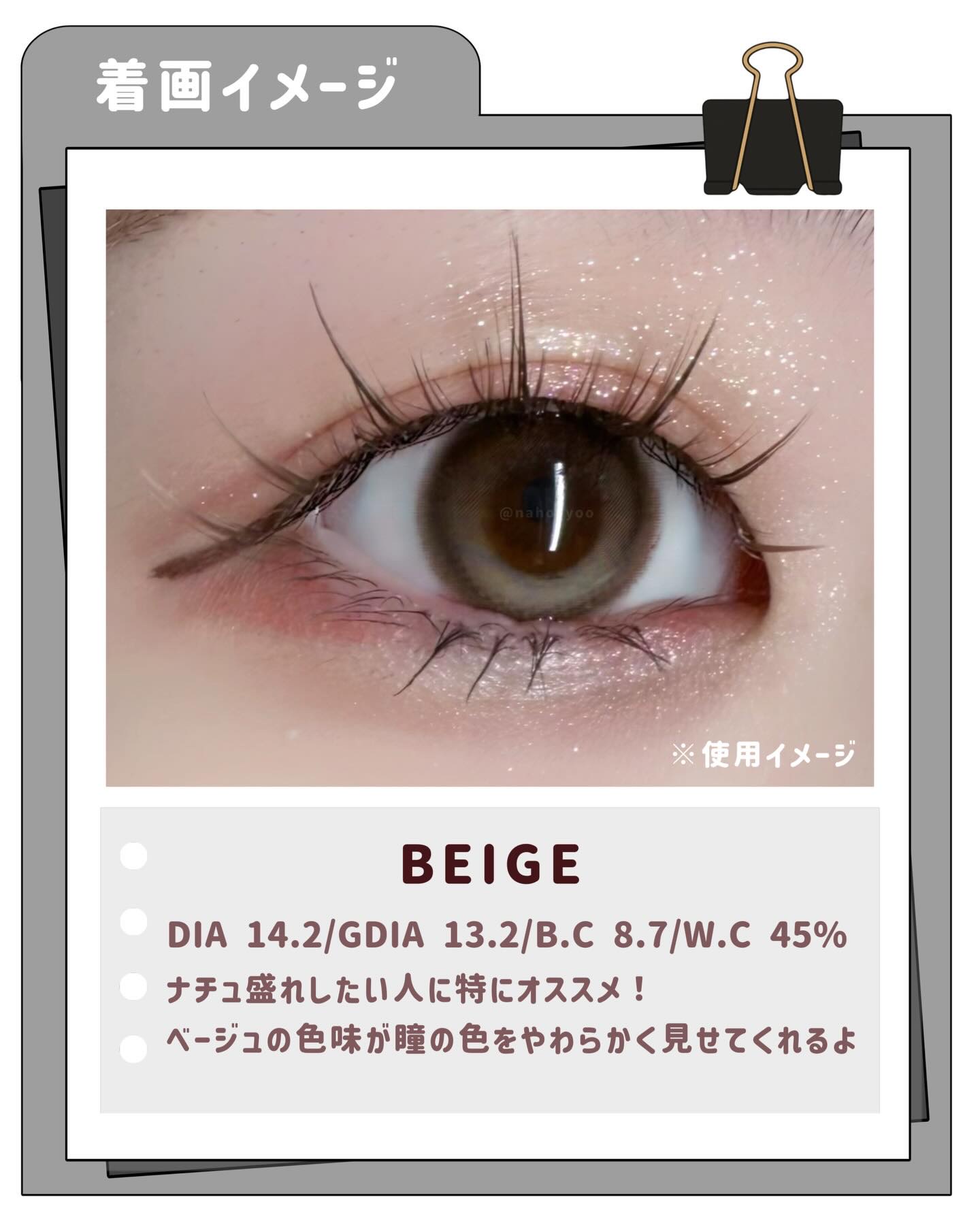 - 明るめクリームベージュで色素薄めなナチュラルカラー カラコンはブランドのイメージに合わせた高発色かつ独創的で大胆なデザインを取り入れつつ、透き通るような水光レンズを取り入れた仕上がりとなっており、シチュエーションに応じて、ナチュラルなテイストやクールテイスト、時にはちゅるんと甘めなスウィートテイストと様々なシーンで大活躍!