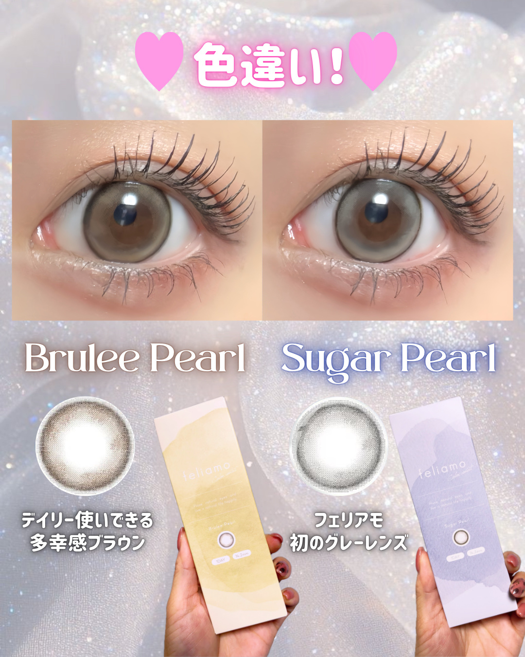 feliamo新作🩷feliamo人気カラー「ブリュレパール」の色違い!feliamoから初のグレーレンズ🩶シュガーパール清楚系の細フチレンズで青によりすぎないから、普段使いもしやすいグレーカラコン🩶着色直径13.5mmで、ナチュラルに盛れる🫶🏻ブリュレパールとの比較もあるよ!優しげデイリーレンズメルティバターじゅわっととろけるような多幸感ブラウンで優しげな瞳を演出できる👍🏻̖́-着色直径13.8mmで、しっかり盛れるしどんなメイクにも合わせやすい!#feliamo#フェリアモ#リリーアンナ#ブリュレパール#シュガーパール#ブリュレパール