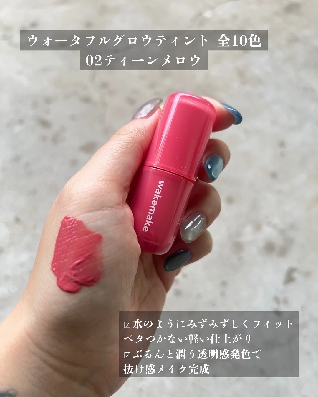 WAKEMAKE ウォータフルグロウティント税込1,650円リップのpoint♡⚪︎水がじゅわっと染み渡るようにツヤめく"コンフォートグロヴ〟✨テクスチャーが水のように軽やかで、唇にフィットし、ベタつきにくい!⚪︎唇の"ちゅるん感”をキープ✨...