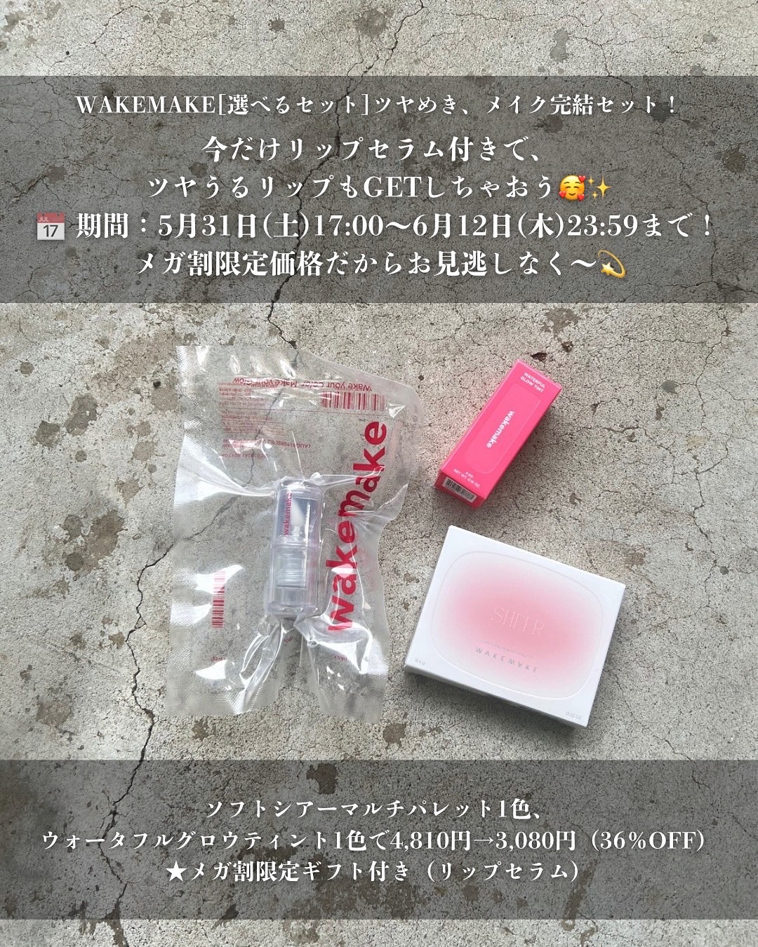 ·͜·ᰔᩚ💗💄メガ割で絶対見逃せない!【WAKEMAKE[選べるセット]ツヤめき、メイク完結セット✨】💖透け感たっぷりの「ソフトシアーマルチパレット」&水のようにみずみずしい「ウォータフルグロウティント」が36%OFFでGETできちゃう😍✨💋リップセラムも限定ギフトでついてうるぷるリップも叶えちゃう💞🌷ソフトシアーマルチパレット全9色💕#02LAZYROSE✅発色も透け感もばっちり!目元に水彩画のような柔らかい色味が広がる✨✅マット&ラメの異なる質感で立体感も演出🌸💦ウォータフルグロウティント全10色🌊02ティーンメロウ✅水のようにみずみずしくフィット✨ベタつかない軽い仕上がり💧✅ぷるんと潤う透明感発色で、抜け感メイク完成💖💖メガ割限定ギフト!WAKEMAKEのリップセラムがセットでついてくる〜!🎁✨🌸ぷるぷるリップに導く秘密💋✅しっとり潤い成分たっぷり配合!乾燥知らずのツヤリップに✨✅軽いテクスチャーでベタつかず、さらっと仕上がる💦✅メイク前のリップ下地にもぴったり!リップティントの色持ちUP🌷🎁今だけリップセラム付きで、ツヤうるリップもGETしちゃおう🥰✨📅期間:5月31日17:00〜6月12日23;59まで!メガ割限定価格だからお見逃しなく〜💫✨👉🏻#PR#WAKEMAKE#メガ割#ウェイクメイク#ソフトシアーマルチパレット#ウォータフルグロウティント#透明感メイク#うるツヤリップ#Qoo10
