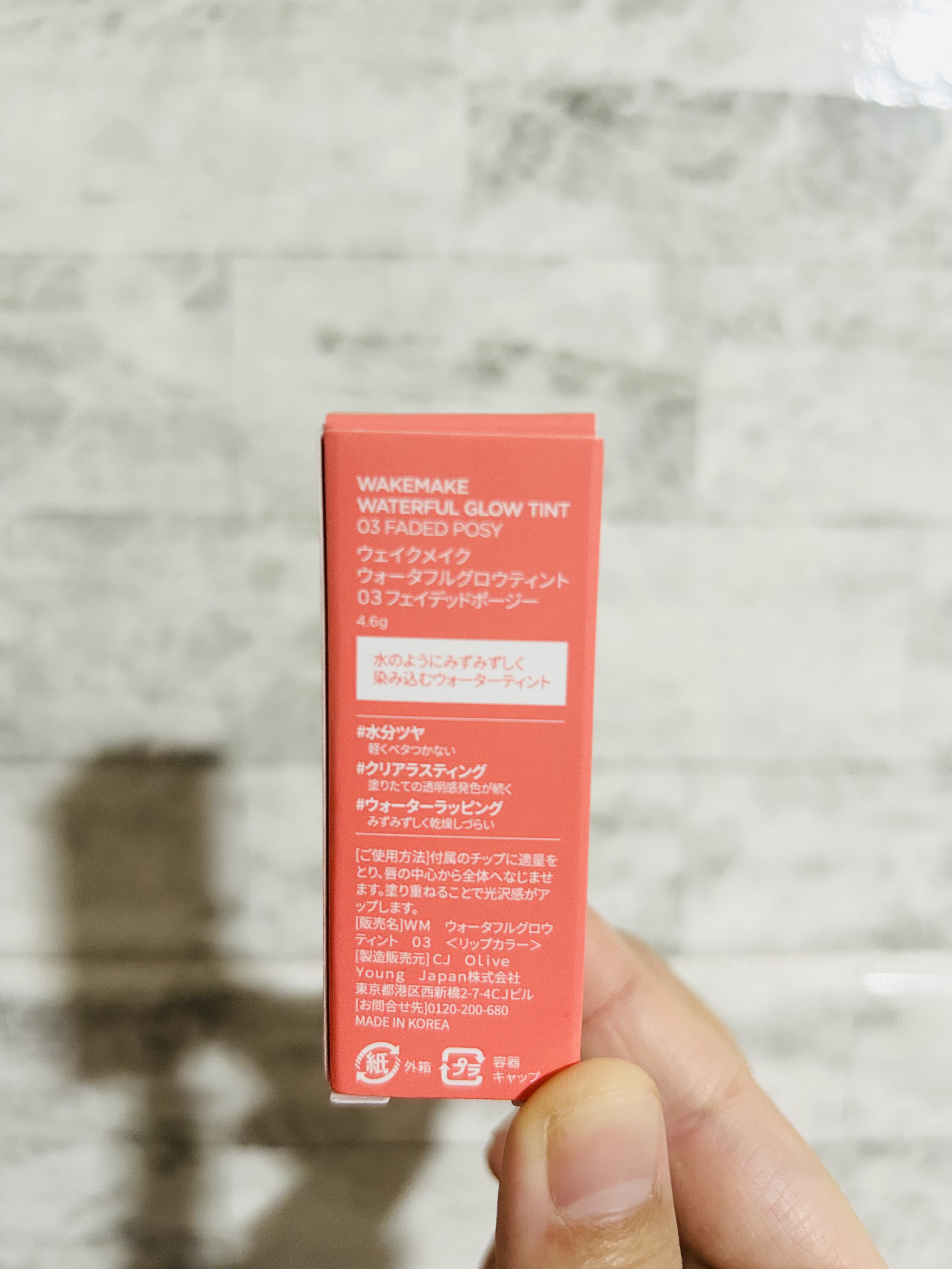wakemake ウォータフルグロウティント 03フェイデッドポージー ¥1,650水のようにみずみずしく染み込むウォーターティント1.水のように軽くベタつかない水がじゅわっと染み込むように、唇に軽やかにフィット。ベタつきのないみずみずしいツヤが生まれる“コンフォートグロウ"2.保湿成分配合で、みずみずしく乾燥しづらい水分が染み渡ったような自然なツヤのある唇を長時間キープ。ちゅるんと水分感のあるテクスチャーが唇を包み込みます。3.塗りたての透明感発色がそのまま続くくすみにくく、塗りたてのカラーがそのままクリアに持続。色のダークニングを誘発する色素の配合量を減らし、ダークニングを最小限にしました。重ね塗りしても透明感はそのまま!まるで水の透明感をそのまま閉じ込めたような、透けちゅる感が魅力の”クリアグロウ”ネットでおすすめされていて、気になって購入😊✨りんごキャンディーのようないい香り🍎✨03フェイデッドポージーは、どちらかと言うとブルベ夏さん向けかな?と思うけど、ニュートラル寄りなピンクなので誰でも使えそう!(きもちほんのりモーヴっぽいかも)鮮やかすぎないのも使いやすくて◎ティント効果もばっちり👍✨すぐティッシュオフしても、ツヤは無くなるけどちゃんとしっかり色が残ります。ただ、少しだけ乾燥が気になるのと、思ってたよりカジュアルな印象かも!