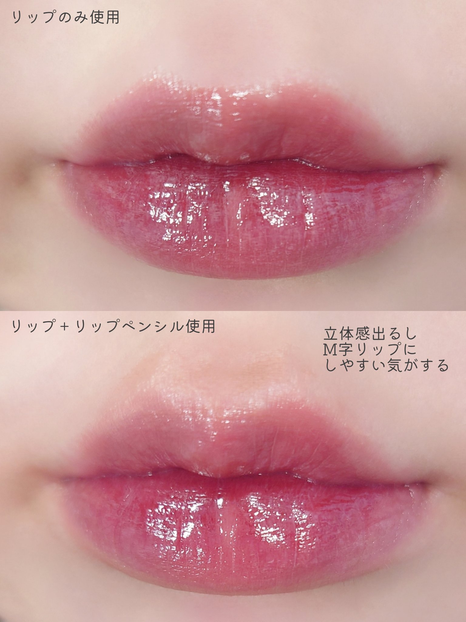 さらりとしたテクスチャでツヤツヤリップに仕上がるティント。 光沢感がかなりあって、むっちりちゅるんとする感じがすごく良い! するするとなめらかに描ける×発色良しな優秀リップペンシル。 筆圧強めな私でも、折れたりせずに描き心地が結構良かった。