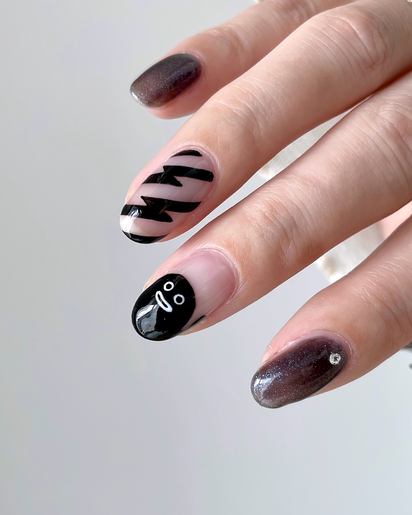 ライブの日はネイルも特別に⚡️🖤@aiainail_⇦他の投稿はこちらから👀GLAYのライブに向けて、ズラーちゃんネイルにしました💅🏻親指のズラーちゃんはスピナーパーツを仕込みクルクル回る仕様に🌀ライブに向かう途中でひっかかって取れてしまうアクシデントもありましたが瞬間接着剤のおかげで乗り切れました🥺ライブはほんっっとうに最高で☺️忘れられない最高の1日になりました♡─────使用カラーGelMe108.OnyxBlack(オニキスブラック)【2025夏限定色】¥1,870(税込)@gelme1オニキスブラックは黒マグにブルー系のラメが入った宇宙を感じる素敵カラー🪐─────🔖保存して、ぜひ参考にしてね♡#セルフネイル部#推し活ネイル#Gelme1#ジェルミーワン#GLAY#ズラー#GLAYEXPO#GLAY30th