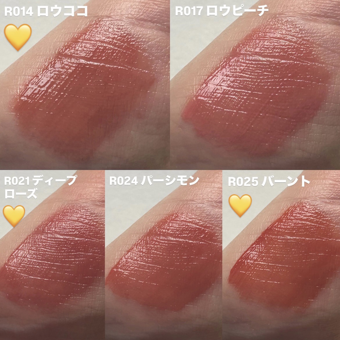 【hinceロウグロウジェルティント手持ちのイエベカラーをスウォッチで比較🌼】#hinceロウグロウジェルティント¥1,760(税込)R026ローズプレッソR002ロウローズR003ロウプリコットR012ロウフィグR014ロウココR017ロウ...