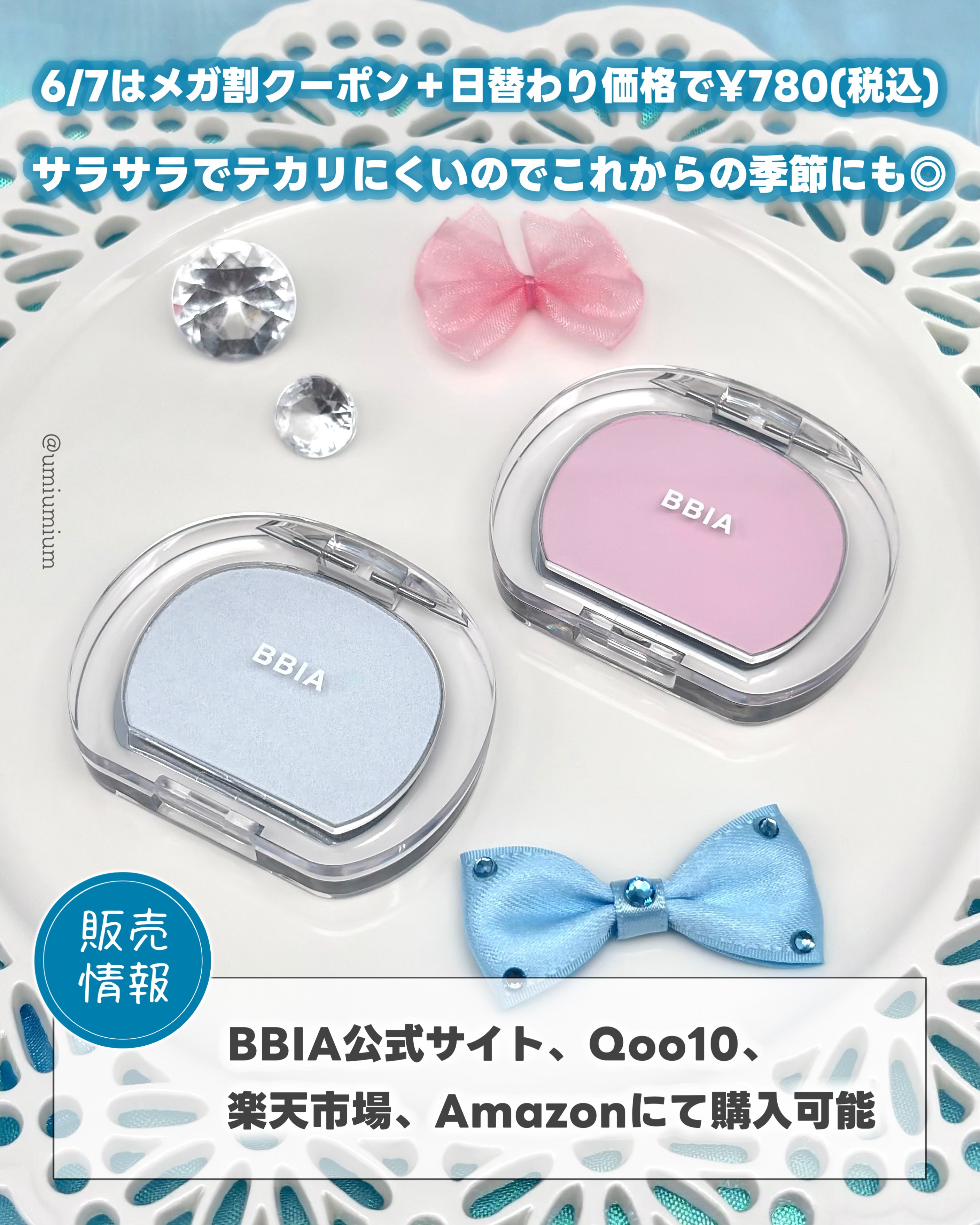 ふわさら!メガ割おすすめBBIAのリニューアルした花びらチーク🌸🩵┈┈┈┈┈┈┈┈┈┈┈┈┈┈┈┈BBIAラストブラッシュ全15色各¥1,200(税込)→各¥960(税込)※Qoo10メガ割クーポン適用時┈┈┈┈┈┈┈┈┈┈┈┈┈┈┈┈こんにちは!うみかです!いつも♡📎フォローありがとうございます😊本日は飲み会リップでお馴染み、BBIAのブラッシュをゲットしたのでご紹介。Qoo10発売直後に購入していたのですがレビュー遅くなりました😭6/12まで開催されているメガ割でお得にゲット出来るのでレビュー。リニューアルして新発売されたBBIAのブラッシュ。花びらみたいな可愛いパケにリニューアルされただけでは無く人気カラーに新色を追加した全15色に👏🏻💗なめらかにフィットする新処方のパウダーでふわさらな仕上がりを実現。ピタッと密着してムラになりにくく毛穴も気になりにくいと思います◎チーク10色、シェーディング4色、ハイライター1色から私が購入したのはこちら💁🏼♀️01ワスレナグサ(ハイライト):シルバーパール入りの涼しげソフトブルー 柔らかい発色で微細なパールなのでシーン問わずに使えそうかなと思います✨05ラベンダー(チーク):※従来品の02ラベンダーブロッサム 透明感のあるミルキーなラベンダー 淡いカラーなのでベースとして使って上から他のチークを重ねると発色が良くなって◎メガ割期間中お安くゲット出来るのですが、6/7はメガ割クーポン+日替わり価格で¥780(税込)と更にお安いので要チェックです✨┈┈┈┈┈┈┈┈┈┈┈┈┈┈┈┈🛒販売情報・BBIA公式サイト、Qoo10、楽天市場、Amazonにて購入可能┈┈┈┈┈┈┈┈┈┈┈┈┈┈┈┈気になっている方のご参考に少しでもなりますと幸いです!その他Instagram投稿はこちらから!@umiumium7777ここまでお読みいただきありがとうございました😊#BBIA#ラストブラッシュ#ピアー#BBIA新作#新作#新作コスメ#新作コスメ2025#バズコスメ#プチプラ#プチプラコスメ#ハイライト#チーク#韓国コスメ#Qoo10#メガ割#Qoo10メガ割#ブルベ夏