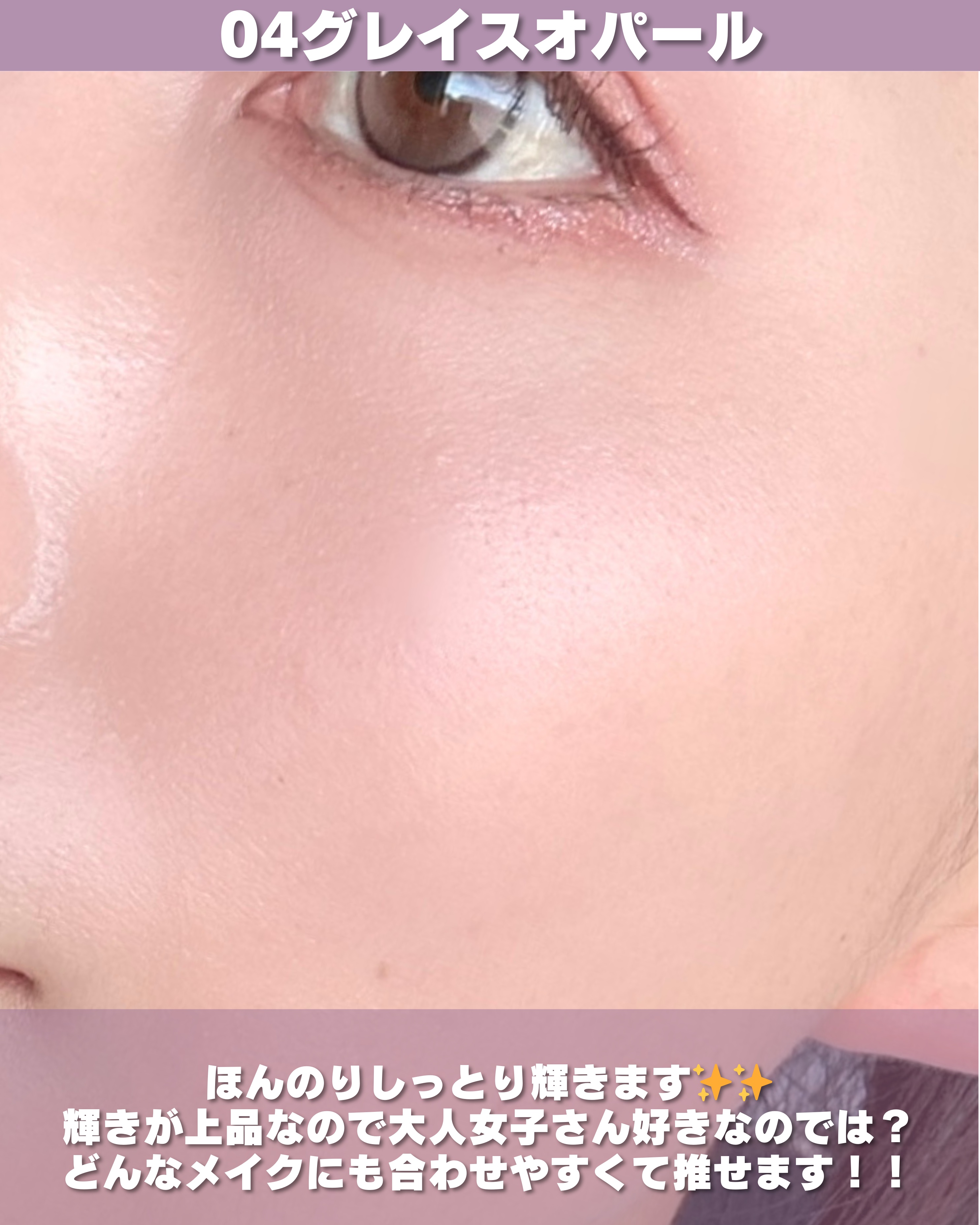 オパールの遊色効果みたいな感じなのか…不思議なハイライターでした最初スウォッチした時、赤みが強くて「イメージと違った」というレビューを書いて投稿予約していたんですが、他の場所で見たら色が変わって見えて投稿書き直しました色名が「グレイスオパール...