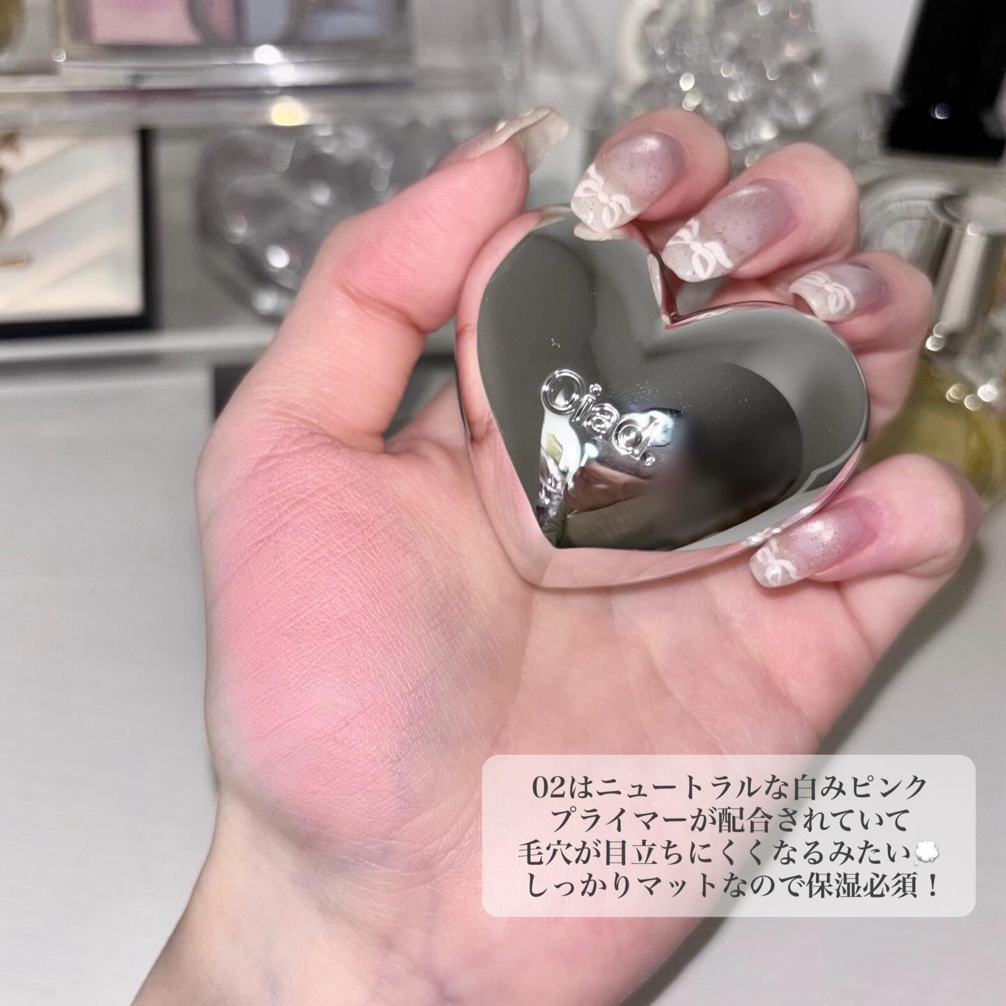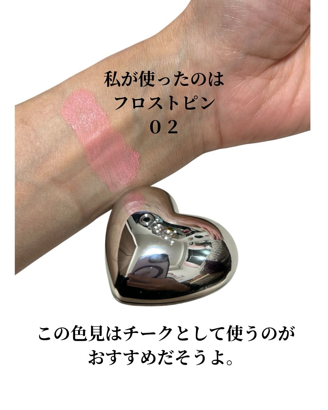 oiadSilverPurseMousseCreamLip&Cheek02FrostPinかわいいハートのパッケージのリップ&チーク!🤍角度のついたチップで塗りやすく色味もかわいい🥺♡*使用感などのコメントはすべて個人の感想です。...