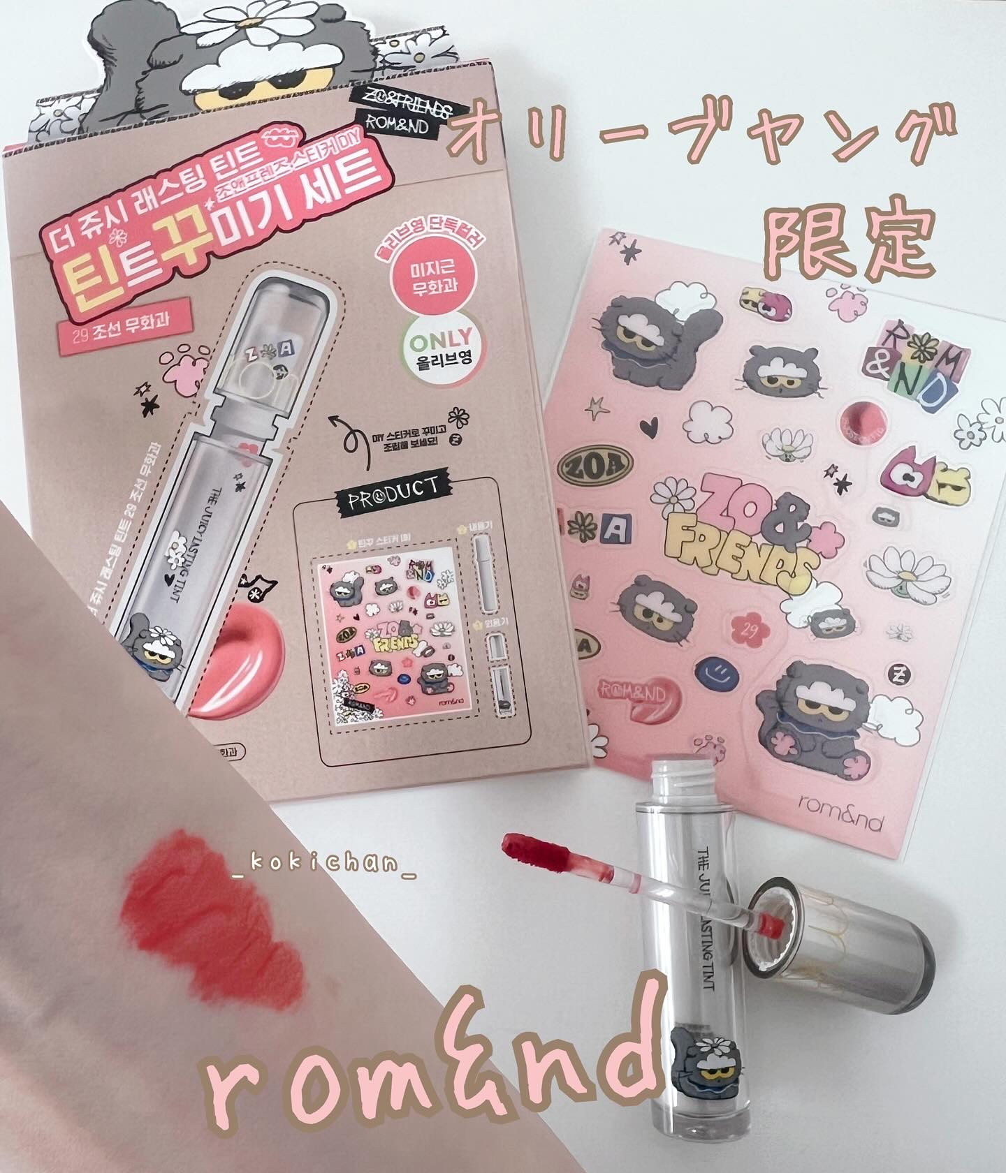 rom&ndザジューシーラスティングティント カラー29 ジョソンフィグイチジクを思わせるカラーまるで砂糖をコーティングしたような透き通る光沢で輝く唇を演出します10種のヒアルロン酸を配合し唇をしっとりと潤わせながら乾燥から守ります使用した感想↓ZO&FRIENDSコラボパケ自分好みにカスタムできる可愛いステッカー付き♡ティント力◎高発色でつや感◎#romnd#ロムアンド#ロムアンドティント#ジューシーラスティングティント#ジューシーラスティングティント29#zofriends#コラボパッケージ#限定パケ#オリーブヤング#限定カラー#韓国#韓国コスメ購入品#韓国ティント#ジヨン#コスメ好き
