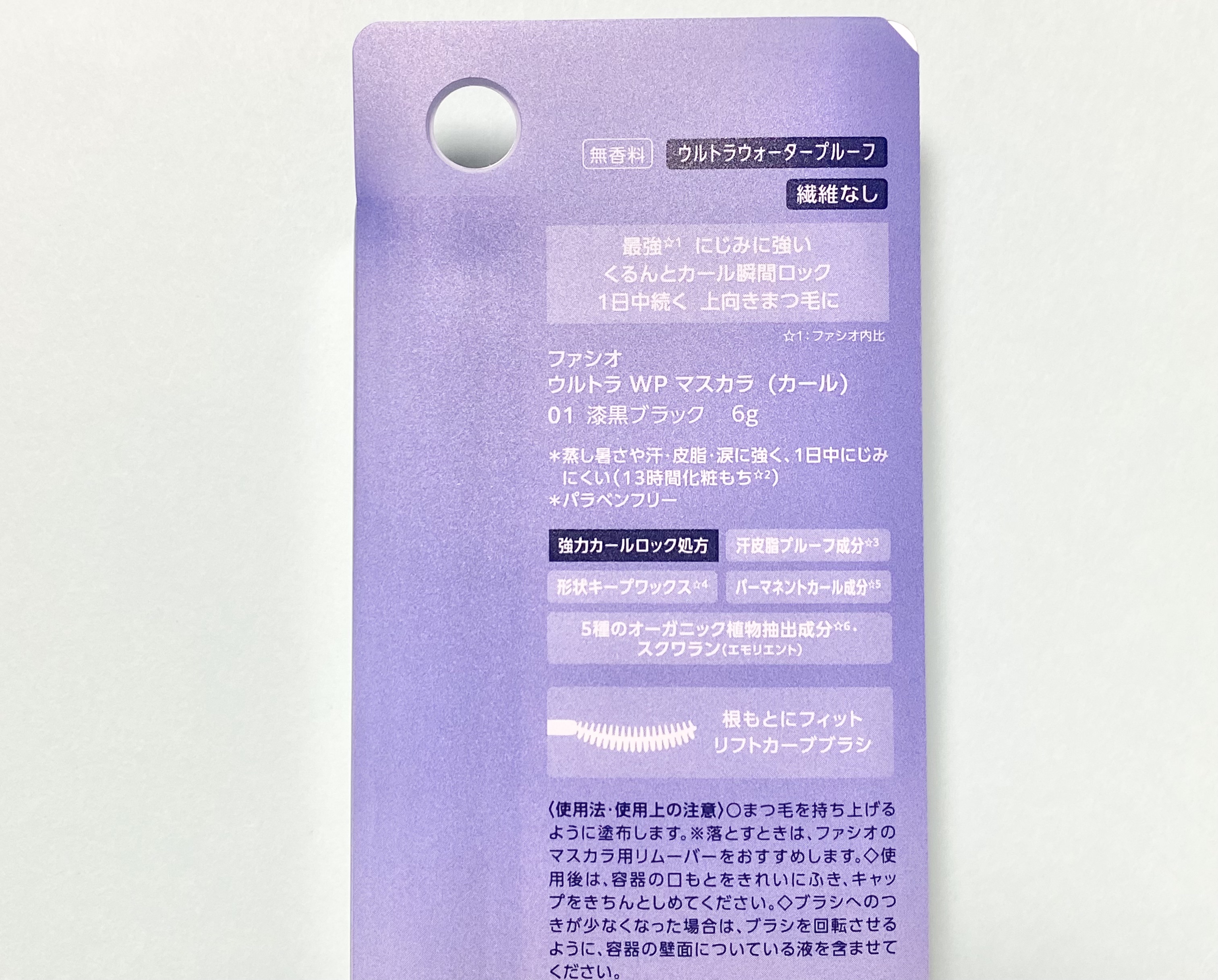 FASIOウルトラWPマスカラカール01漆黒ブラック最強★1にじみに強く、瞬間カールロック!上向きまつ毛が1日続く、即戦力マスカラ。★1:ファシオ内ウルトラウォータープルーフ/汗・皮脂・涙・水に強い/13時間化粧もち/繊維なし〈商品特長〉●どんなシーンでも、カールが落ちない・にじまない!1日中カールロックするマスカラです。 蒸し暑さや汗・皮脂・涙・水に強いウルトラウォータープルーフタイプで、塗りたての美しい仕上がりが長時間持続します。●「強力カールロック処方」採用。まつ毛を根もとからカールアップして瞬間ロックし、長時間キープします。 ・「形状キープワックス」配合。まつ毛への付着性・密着性が高く、カールアップさせながらかたい膜を形成します。 ・「汗皮脂プルーフ成分」配合。強固な膜を形成し、汗・皮脂・涙・水にもにじみにくい高い化粧もちを叶えます。 ・「パーマネントカール成分」配合。まつ毛をカールアップさせながら適度な柔軟性のある膜を形成し、まつ毛のしなやかさを保ちます。●柔らかいベースがまつ毛先端まで均一にのび広がり、繊維なしタイプながらも、まつ毛の先端がぐんとのびたようなロング仕上がりを叶えます。また、まつ毛への付着性に優れ、適度にボリュームを与えます。●まつ毛の根もとにフィットしやすいリフトカーブブラシを採用。●13時間化粧もち★2。塗りたての美しい仕上がりが長時間持続します。★2:当社調べ。効果には個人差があります。●5種のオーガニック植物抽出成分配合。やさしい使い心地にこだわった設計です。●パラベンフリー●無香料〈配合成分〉●形状キープワックス●汗皮脂プルーフ成分 ●パーマネントカール成分●5種のオーガニック植物抽出成分・スクワラン(エモリエント)形状キープワックスはポリエチレン。汗皮脂プルーフ成分はトリメチルシロキシケイ酸。パーマネントカール成分はカルナウバロウ・ヒマワリ種子油。5種のオーガニック植物抽出成分はオリーブ果実油・ホホバ種子油・サフラワー油・シア脂・ゴマ種子油。#FASIO#ウルトラWPマスカラカール#漆黒ブラック