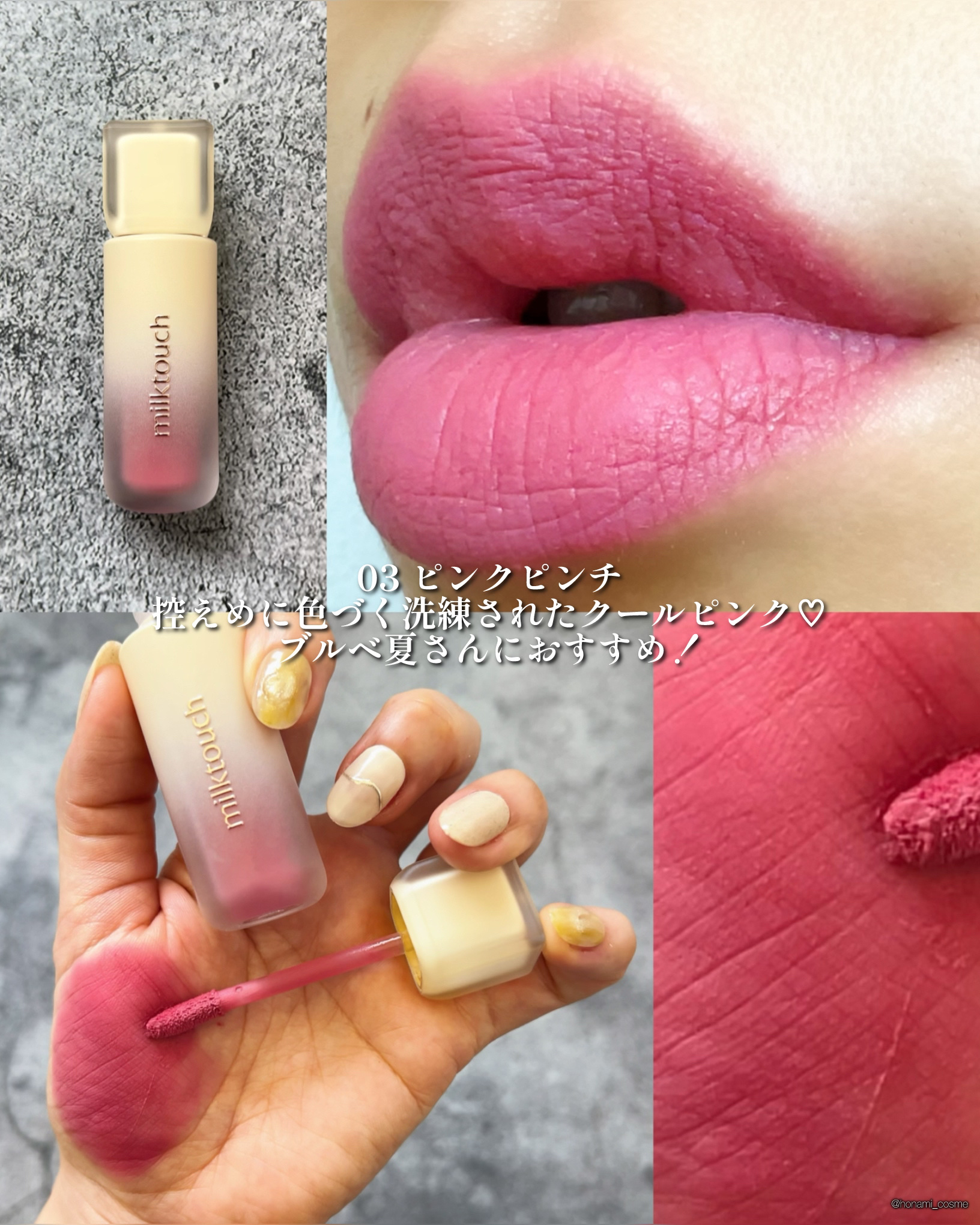 ...milktouch🤍SpreadFitBlurTintミルクタッチからマットティントが新登場👏🏻👏🏻まるでクリームチーズのようななめらかな新感覚テクスチャー🧀高密度パウダー&やわらかジェルの絶妙なバランス濃密でなめらかな塗り心地で唇にフ...