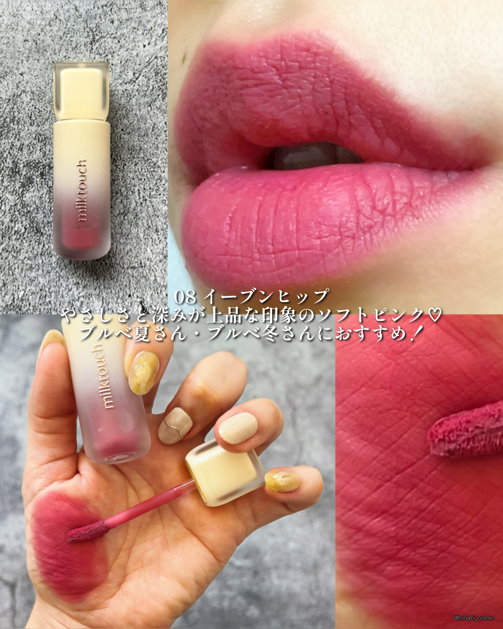 milktouch新作全色スウォッチ🍑プレキャンに当たりクリームチーズリップの8色いただきました!ふわっとスフレみたいなテクスチャーに、マットリップなのにプランパー成分が入ってるのが特徴。おかげで乾燥しにくくて、縦ジワも消えてめちゃくちゃ好き...
