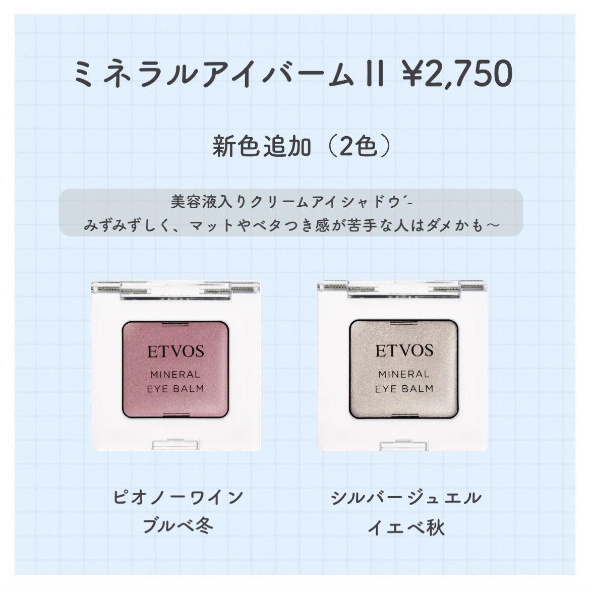 ETVOSの新作カラーメイクアイテム#ミネラルアイバームシルキーミルクベージュ2,750円(税込)透明感を引き出す明るめベージュ✨#ミネラルアイバームシルバージュエル限定2,750円(税込)華やかな輝きを放つグリッターシルバー✨...