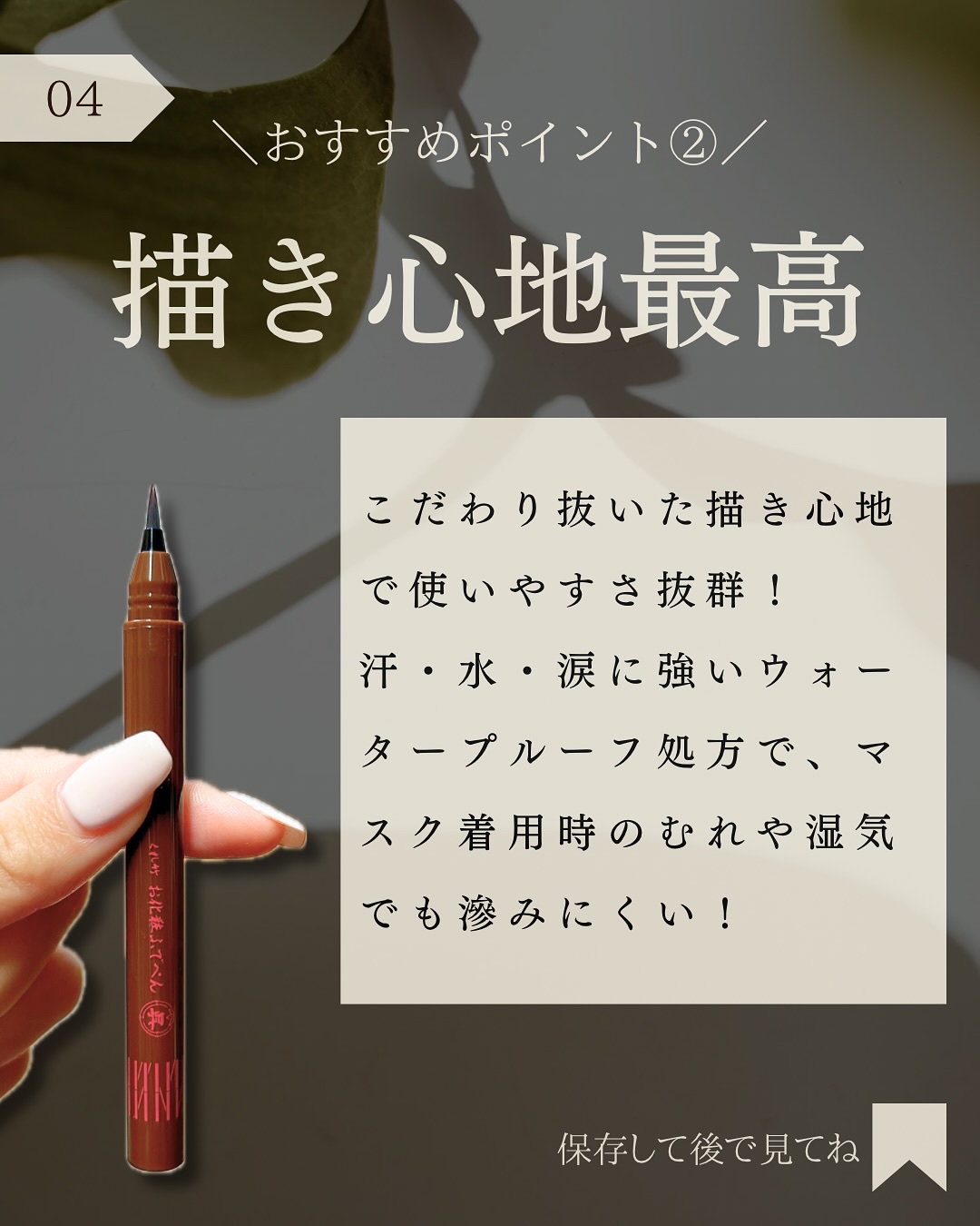 □長年の墨造り・インク開発の技術を 生かした発色の良さ□こだわりの描きごこち□速乾&ウォータープルーフ□細筆:絶妙な弾力の筆先で はね上げラインを美しく🙋♀️使ってみて....!くれ竹筆ぺんのイメージが強かったんやけどメイク用品もあるとはび...
