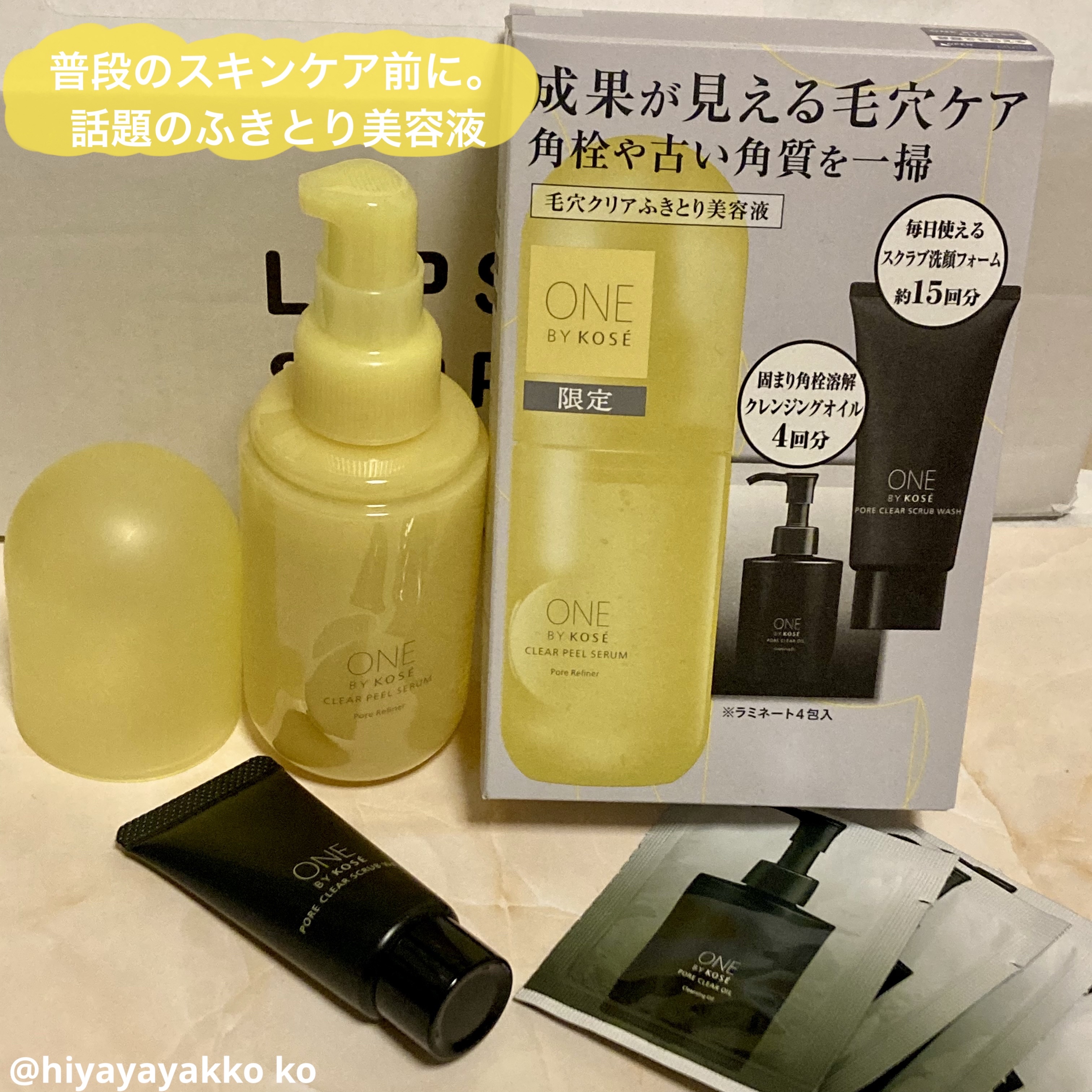 ONEBYKOSEクリアピールセラムの限定キット、リピ買いです〜前に買ったのがまだなくなってないけど、金額合わせのために早めに購入。お得な限定キットまだあります。クレンジングオイル4包とミニサイズの洗顔15回分も付いてるのでお得です!これからのおでかけシーズンにも便利ですよ〜ピーリング本体は最初は毎日だけど、使用頻度は徐々に減らしていいらしいのでコスパはなんとも…ピーリングにこの値段は少しお高いので悩みますけどね…使うと使わないじゃ少し差がある気がするので気に入って使ってますけどね!興味があるうちはしばらく使うかも。