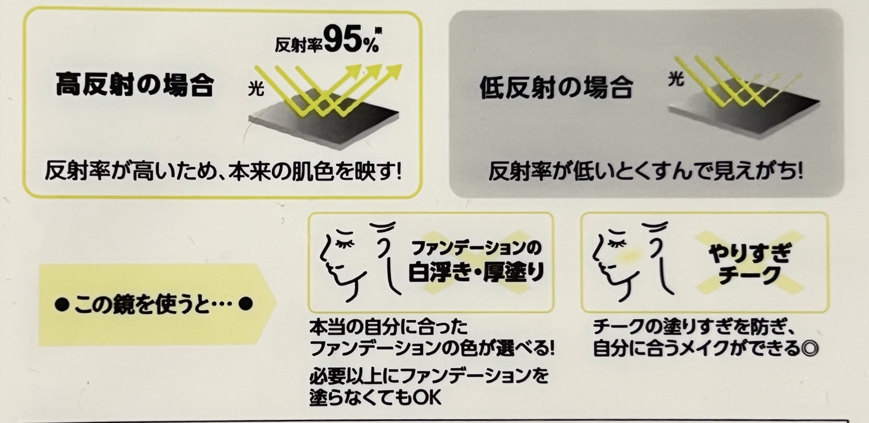 - リアルックミラーは【銀引きミラー】を使用しており、反射率95%(ミラー反射率計でJIS D5705の測定方法をもとにハロゲンランプを照射し測定した結果)の高反射により、見たままの本来の肌色を映します。 手軽に使えるミニサイズなので、小さなバッグやポーチに入れて持ち運び可能です。