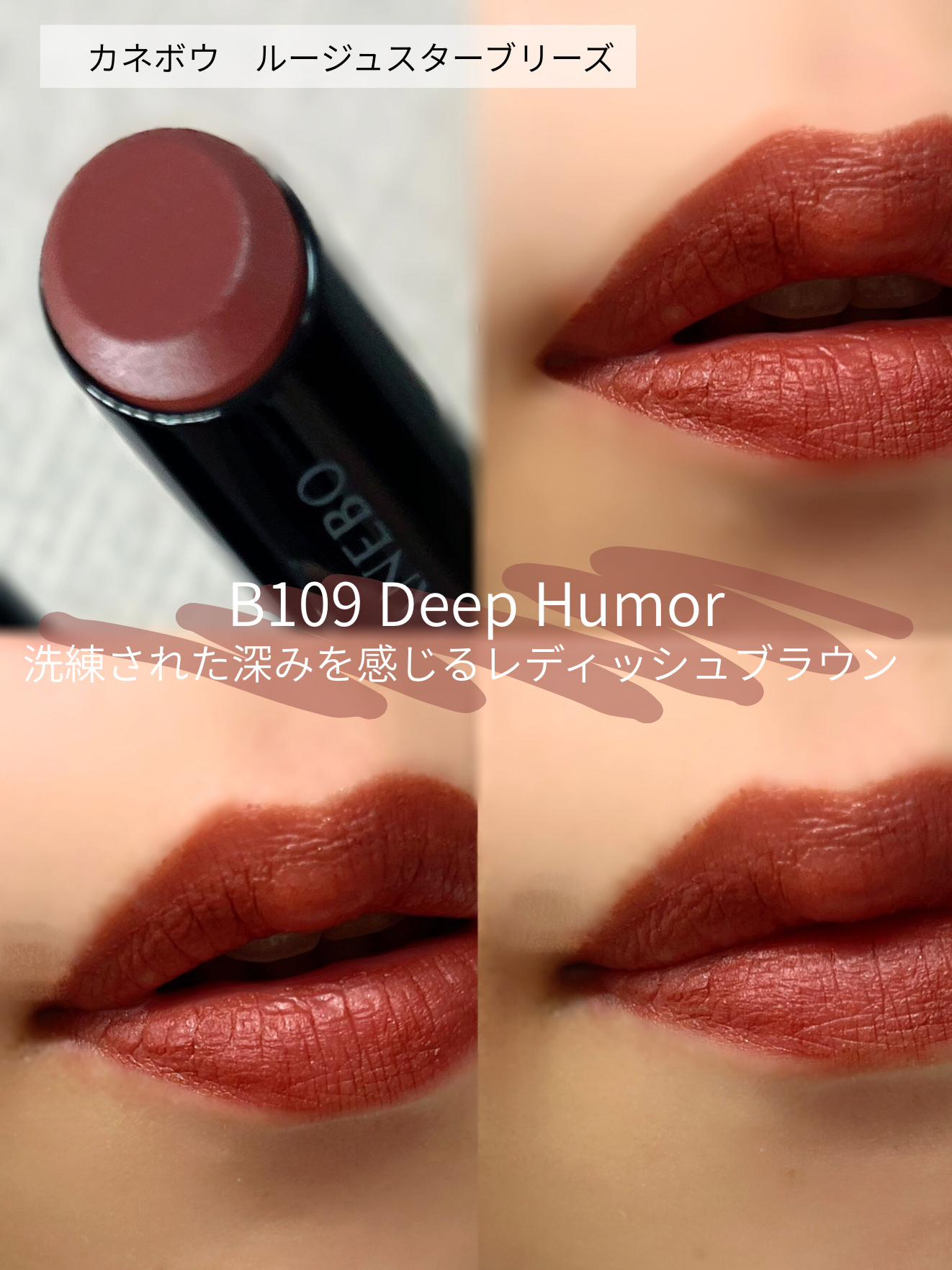 KANEBOカネボウルージュスターブリーズB109DeepHumor¥4,620【色味】ブラウンレッド【色もち】良い落ちにくい【質感】マット【保湿】乾かないように私は下地を使っている【良いところ】カッコいい系のメイクになる顔がしまる【イマイチなところ】下地をつけないと乾燥が心配かな#耐久コスメ選手権