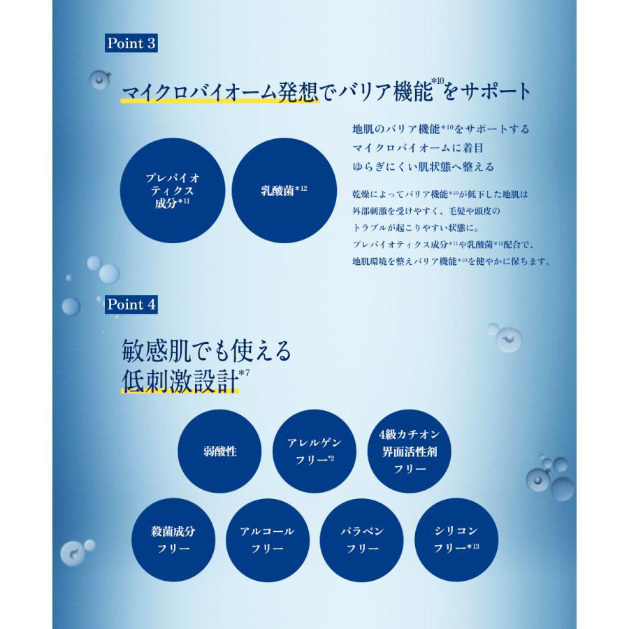 - 肌と美髪の両方を満たす、オールフリー*1美容液シャンプー/トリートメント。 シャンプーは80%以上、トリートメントは93%以上の美容液*2配合。髪の芯まで潤いを与え、毛髪内部の水分バランスを整えることで、乾燥によるうねりやクセをケアし、しっとりまとまる髪へ導きます。 さらに、マイクロバイオーム発想で地肌のバリア機能*3をサポート。外部刺激にゆらぎにくい、健やかな状態の地肌を保ちます。 敏感肌の方でも使いやすい低刺激処方*4で、お子さまから大人までお使いいただけます。 ミュゲ&リリーの香り。 *1 食物アレルギー表示対象28品目不使用、パラベンフリー、着色料フリー、鉱物油フリー、タルクフリー、紫外線吸収剤フリー、サルフェートフリー、パラフィンフリー、PGフリー、アルコールフリー(エタノールフリー)、殺菌成分フリー、4級カチオン界面活性剤フリー、動物由来成分フリー、グリセリンフリー、マイクロプラスチックフリー *2 保湿成分(水を含む) *3 頭皮の角質層の水分を保ちながら保護すること *4 パッチテスト済み/すべての方にアレルギー・肌トラブル・肌刺激が起こらないということではありません