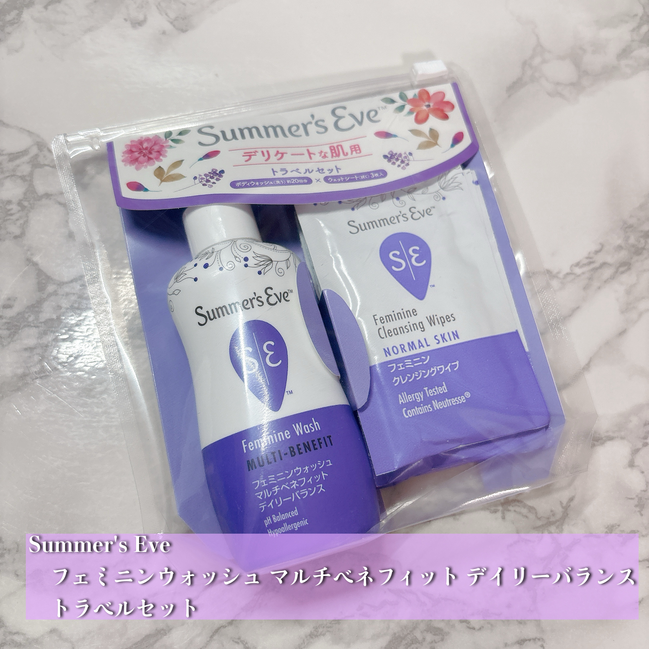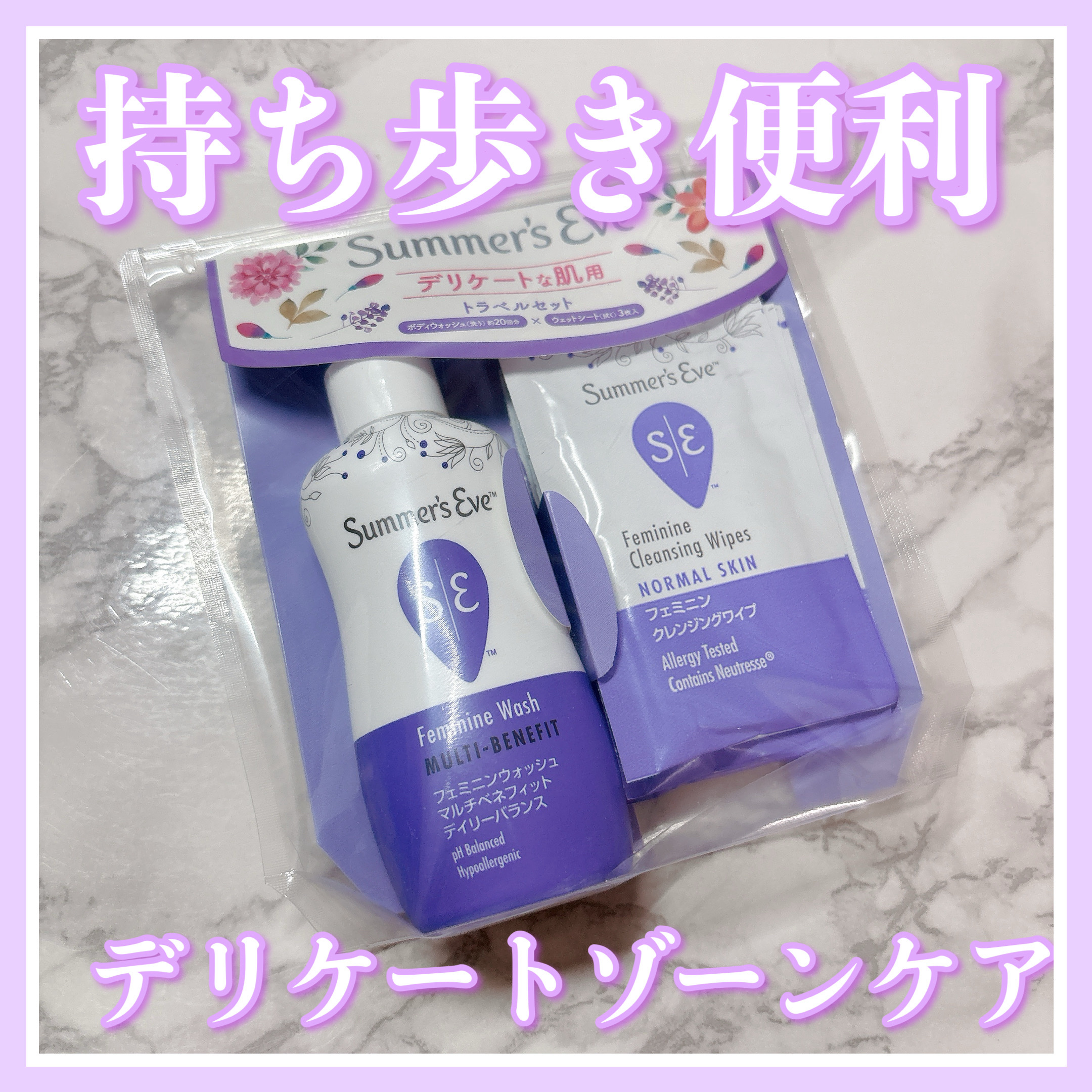 持ち歩き便利✨デリケートゾーンケアSummer'sEve フェミニンウォッシュマルチベネフィットデイリーバランス トラベルセット(ボディウォッシュ59ml20回分 ウェットシート3枚)✅特徴・デリケートゾーン用に設計された弱酸性ボディウォッシュで、ニオイ・ムレ・皮脂汚れの原因となる汚れをそっと洗い流す。特に「ニオイのもととなる汚れの除去」にアプローチ✨・必要以上に皮脂を取りすぎず、肌のバリアと潤いを守りながら洗えるため、肌が敏感な日や季節の変わり目にも使いやすい設計。・トラベル用ミニボトル(59mL)とウェットシート3枚入りで、旅行・ジム・生理中・外出先でのフェムケアにも便利。携帯性が高く、いつでも清潔ケアできるのが嬉しいポイント。・弱酸性・ソープフリー・肌にやさしい成分構成で、デリケートゾーン専用として安全性を意識。普段のボディソープ代わりにはもちろん、生理中や汗かき後などにも使いやすい。💆♀️感想旅行や外出時にもポーチに入れておけるサイズ感がとても便利で、荷物が多くなりがちなときでも気軽にフェムケアできるのがありがたい✨泡立ちもやさしくて、「ごしごししなくていい」から、敏感な肌の日でも安心。洗い上がりはさっぱりしているのに、つっぱり感はなく、清潔感と快適さのバランスがちょうどいい。ムレや皮脂、汗で気になりやすい季節や、生理時の不快感対策にも頼りになる一品。外出先、ジム後、旅行中など“いつでもきれいに”を叶えてくれる心強さ。デリケートゾーンのケアを特別ではなく“日常の当たり前ライン”にしてくれる、使いやすさと安心感のあるフェムケアアイテムだと思います🌿#SummersEve#フェミニンウォッシュ#デイリーバランス#フェムケア#デリケートゾーンケア#ムレ対策#皮脂ケア#ニオイ対策#トラベルセット#旅行コスメ#ジム後ケア#日常ケア#ソープフリー#弱酸性#ボディウォッシュ#清潔ケア#女性のためのケア